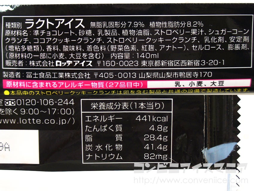チョコレートのおいしさとクランチ系のサクサク感、そしてやさしい味わいのストロベリーアイスの組合せ。