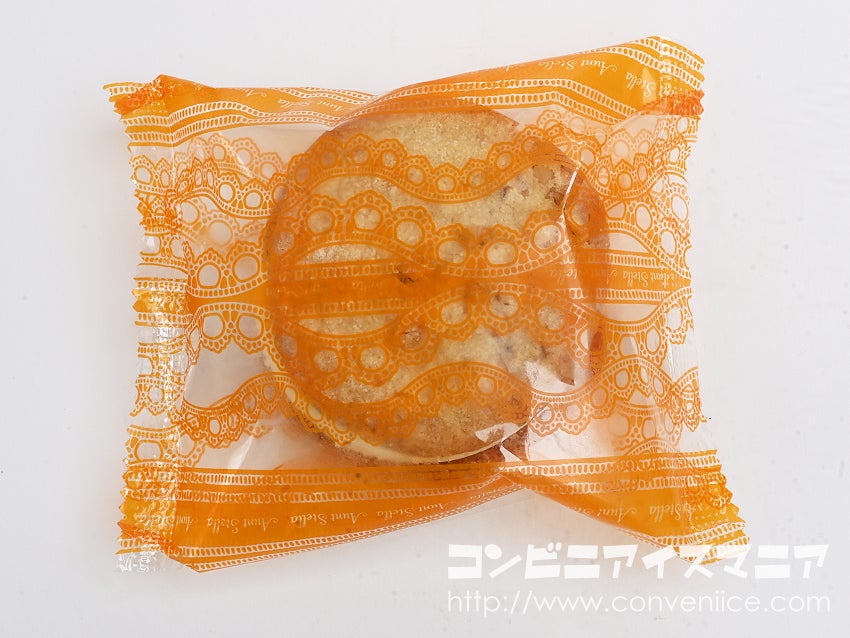 箱から取り出すと、ビニール製の透明中袋に包まれたアイスサンドが登場。オレンジ色の柄(模様)に”Aunt Stella”(ステラおばさん)の文字。毎回フレーバーに合わせて色を変えているのもスゴイ。