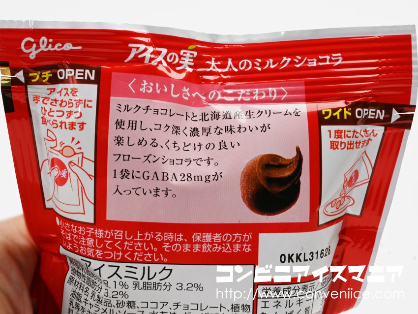 ハイカカオチョコレート使用の「大人のショコラ」に続く第2弾。今回はミルクチョコレートを使用した「大人のミルクショコラ」。すでにおなじみのシリーズになりましたが、グリコの“大人シリーズ”は、通常版にくらべて、より上質で価格もちょっと高級。大人向けの仕様になっています。