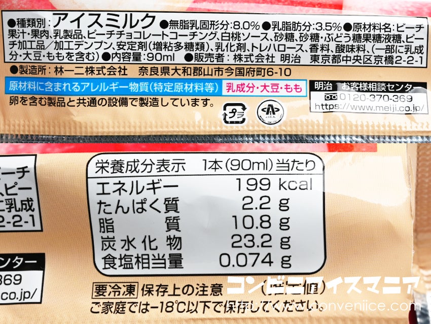 チョコレート部分に桃果汁20%、アイス部には果汁・果肉60%を贅沢に使用。さすが明治リッチシリーズ!