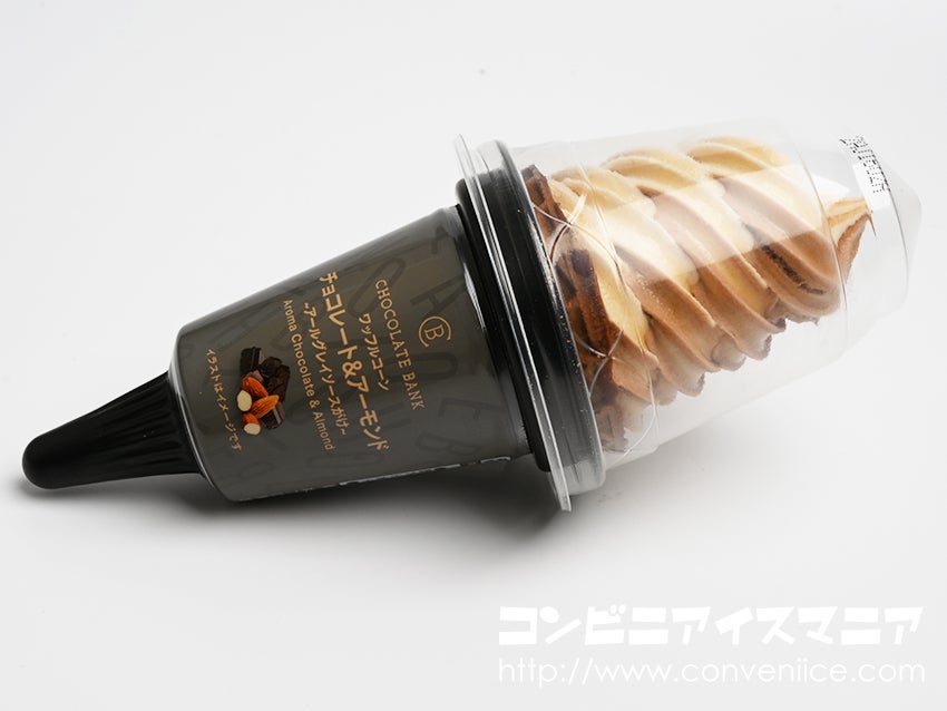こちらも「CHOCOLATE BANK(チョコレートバンク)」とセブン-イレブンが共同開発したアイス。カップタイプの「リッチチョコミント」と今回の「ワッフルコーンチョコレート&アーモンド」2品が同時発売しています。ソフトクリームタイプのワッフルコーンですが、見るからに高級そうなビジュアルです。しかもフレーバー名も複雑。実際に食べてみないと、まったく味の想像ができません。