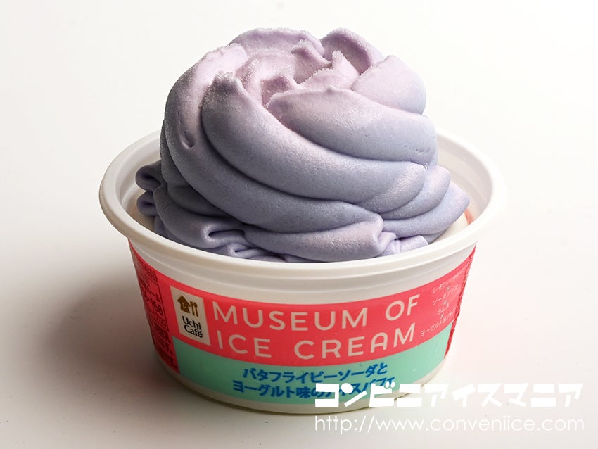 紫基調のグラデーションカラー。ほかにはないユニークなカラーと形状!秋田のババヘラアイスを彷彿させるビジュアルです。 一度下層のアイスを固めて、上に花形のアイスを乗せているってことですよね。うーん…製造工程を見てみたい。こういう手作業の工程が入る商品をつくれる場所(工場)は限られます。ワッフルコーンよりもMOIC感が圧倒的に強めです!