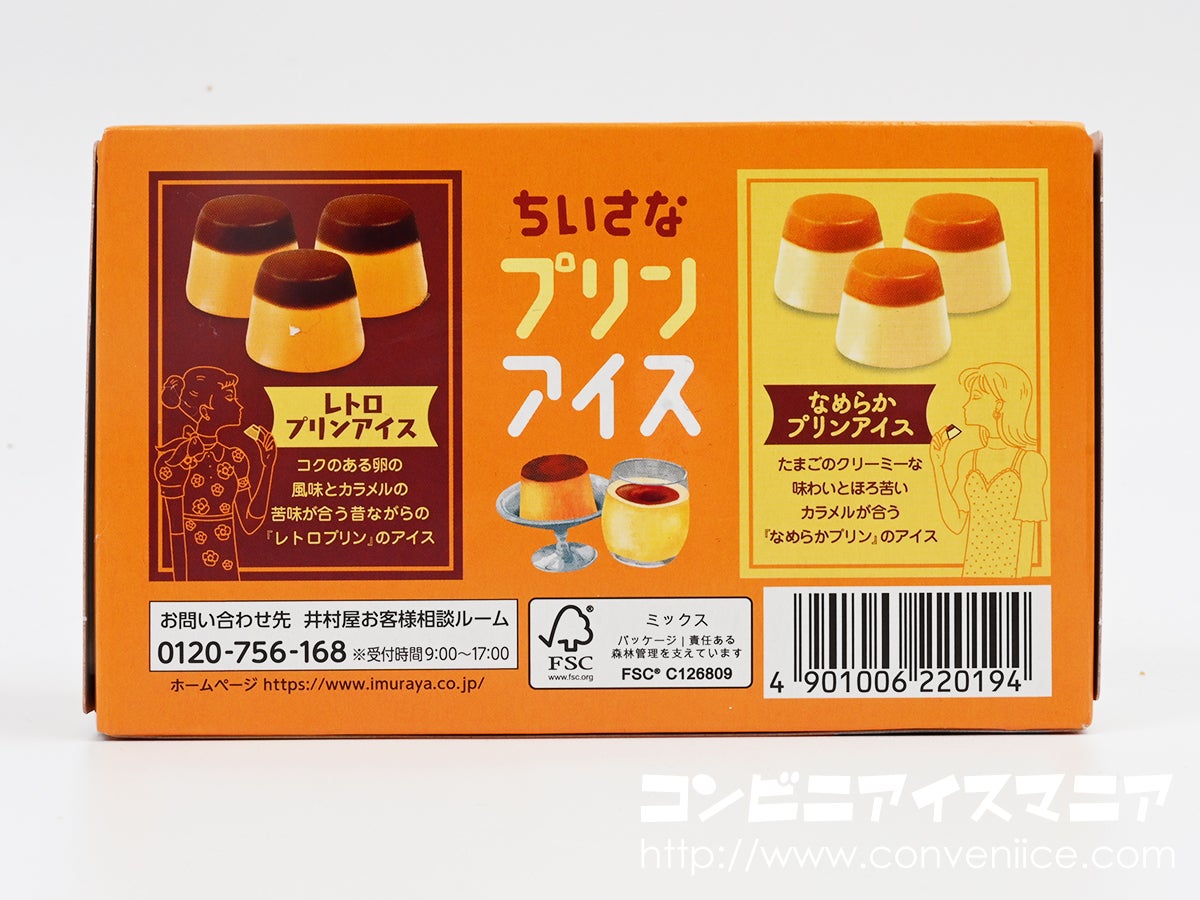箱の底部には、「レトロプリンアイス」と「なめらかプリンアイス」2種類それぞれのフレーバー説明が記載されています。