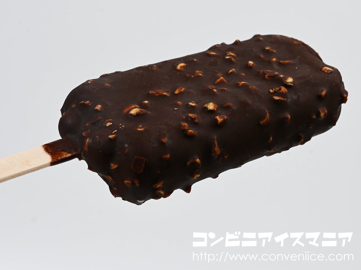 外側はパリパリのチョコに散りばめられた香ばしいナッツ。内側には、あっさりとしたラクトアイスグレードのバニラアイスが詰まっています。素材や構成はシンプルだけど、その分「王道感」のあるアイスバーです。形は違えど、たしかに「うまか棒」の味だ。今こうして食べてみると、いたって普通のアイスバーなんですが、当時は熱狂しました。