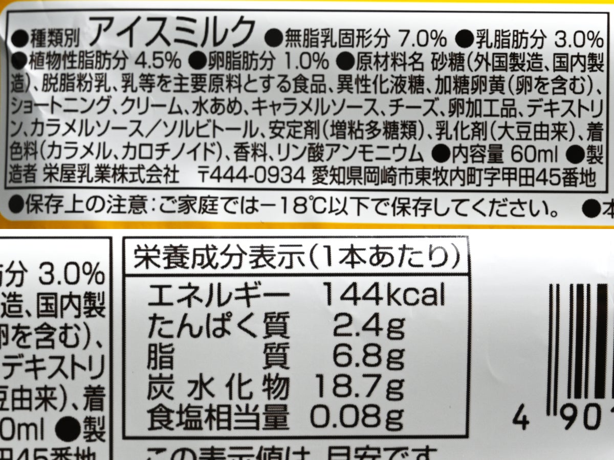 内容量は60mlとアイスバーとしてはかなり小ぶりなサイズ。アイス表面には茶色のカラメルコーティング。形状とビジュアルは、以前発売された「イタリアンプリンアイスバー」に似ています。
