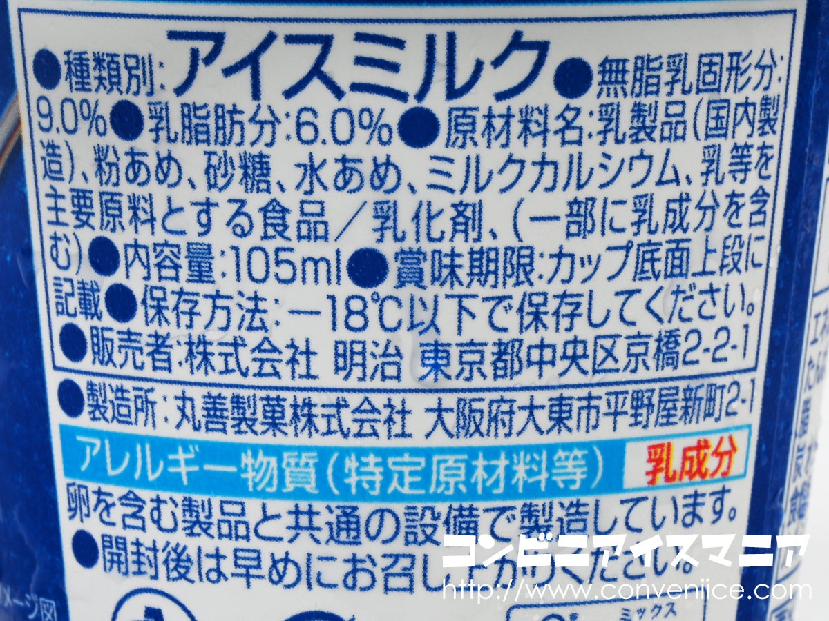 種類別はアイスミルク規格。製造は丸善製菓株式会社(明治の協力会社)。1959年設立のアイスクリーム製造会社です。