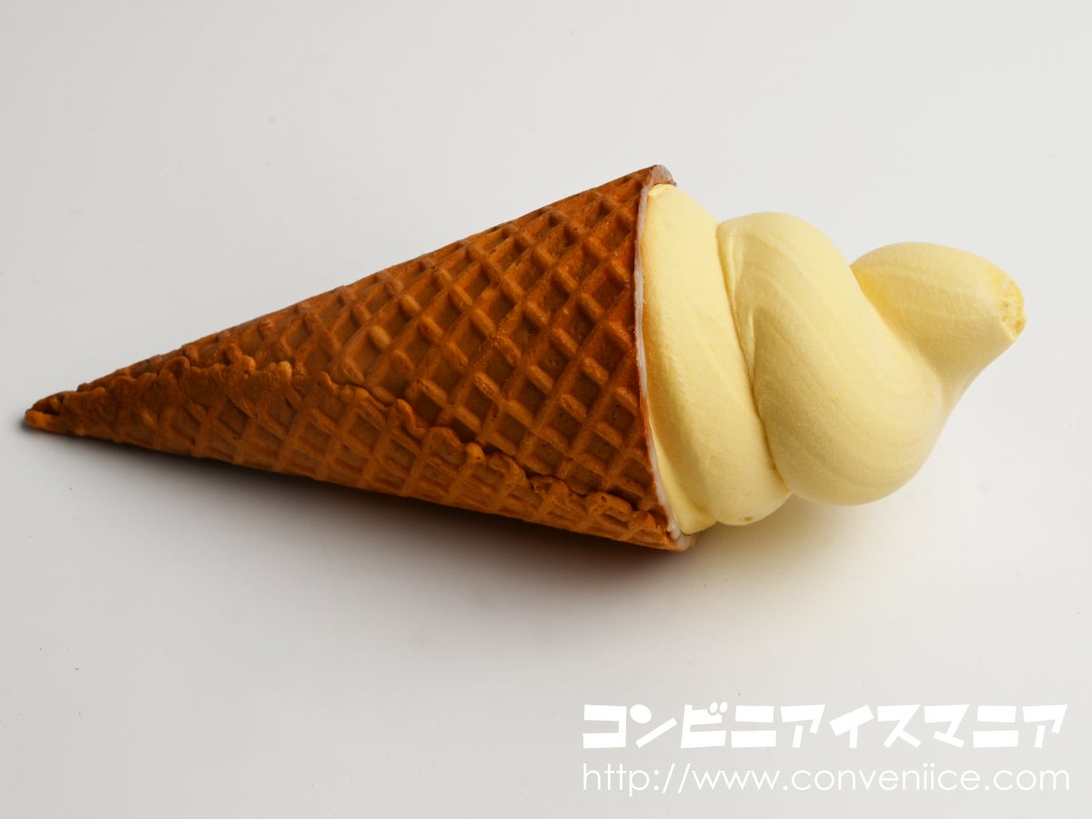 容器から取り出すと、太巻き仕様のソフトクリームタイプのアイスが登場。ワッフルコーンはシュガーコーン仕様です。