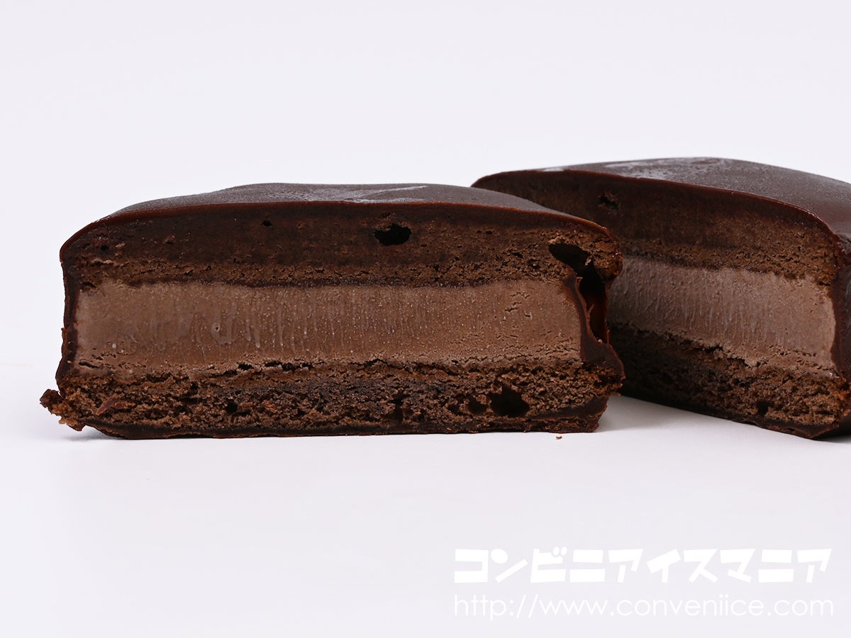 冷凍下でもしっとりとやわらかいチョコケーキで、カカオが香る濃厚なチョコアイスをサンドし、アイス全体を覆ったチョコレートは薄くコーティングされ、パリッとした食感。くちどけも抜群です。生地部分は冷凍下でもやわらかい、しっとりとした食感のチョコケーキ。そしてアイス部は、カカオ香る濃厚なチョコレートアイス。