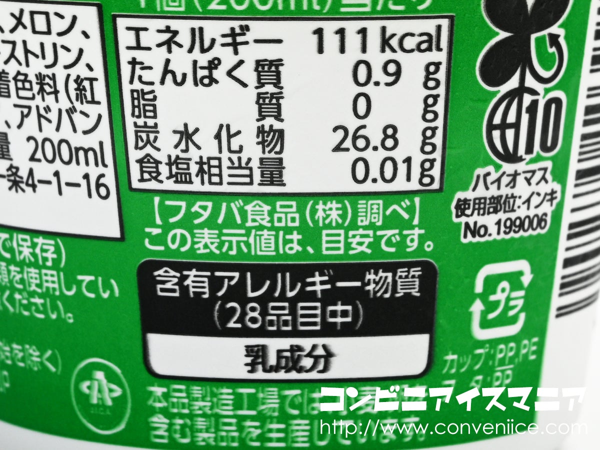 パッケージはメロンを連想させるグリーン基調で、蓋の縁にはメロンの網目模様を思わせるデザインが施されています。また、オレンジとグリーンの組み合わせにより、2種類のメロンが使用されていることが巧みに伝えられています。蓋が透明なのでグリーンのメロンかき氷が透けて見えて、ビジュアル的にも魅力的です。