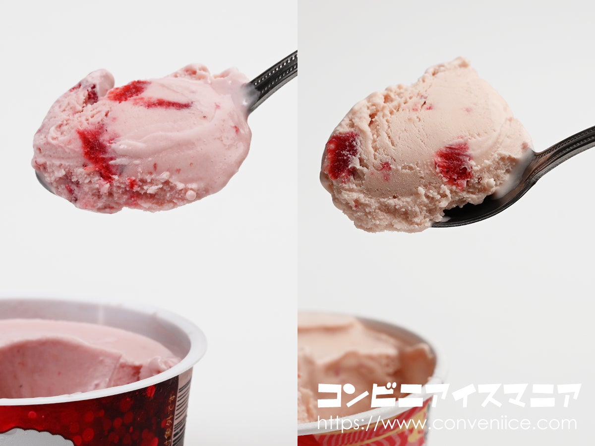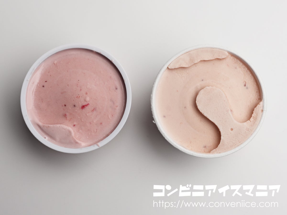 ふたつのフレーバーを並べてみると、「紅苺」の方がアイスクリーム自体のピンクの色が濃く、味や食感も「紅苺」のほうが圧倒的に苺の果肉感が強いです。一方、基幹商品である「ストロベリー」はミルクと苺の風味のバランスが良いです。「紅苺」の方がいちごの味が濃く、より贅沢な味に仕上がっていることは明らかですが、ミニカップ「ストロベリー」自体の完成度が高いため、好みは分かれそうです。