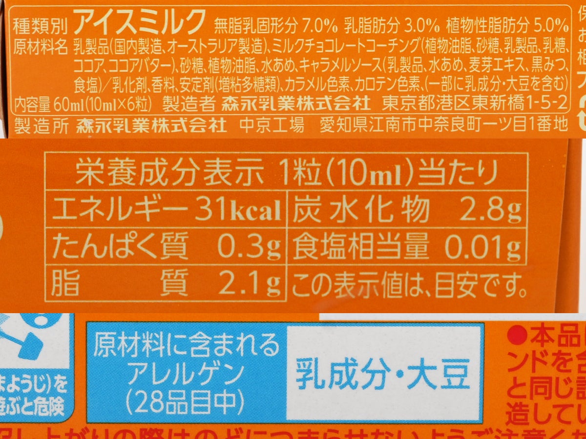 蓋の裏側は全面がキャラメルカラーで、そこには白い文字で「キャラメル×バニラ=おいしかった!」というシンプルながら印象的なメッセージが記されています。この蓋の裏側のメッセージと箱の裏側の説明を合わせて考えると、このフレーバーは開発研究チームが様々な配合を検討し、最終的なにたどり着いた自信の味ということが読み取れます。「組み合わせてみたら、おいしいフレーバーができちゃったのでちょっと食べてみてよ!」という感じですね。