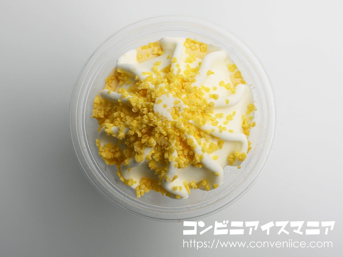 透明プラスチック製カップ越しに見える多層構造が、このパフェの見どころ。上層には、スッキリとした甘さとほんのり酸味が特徴の真っ白なチーズアイス。