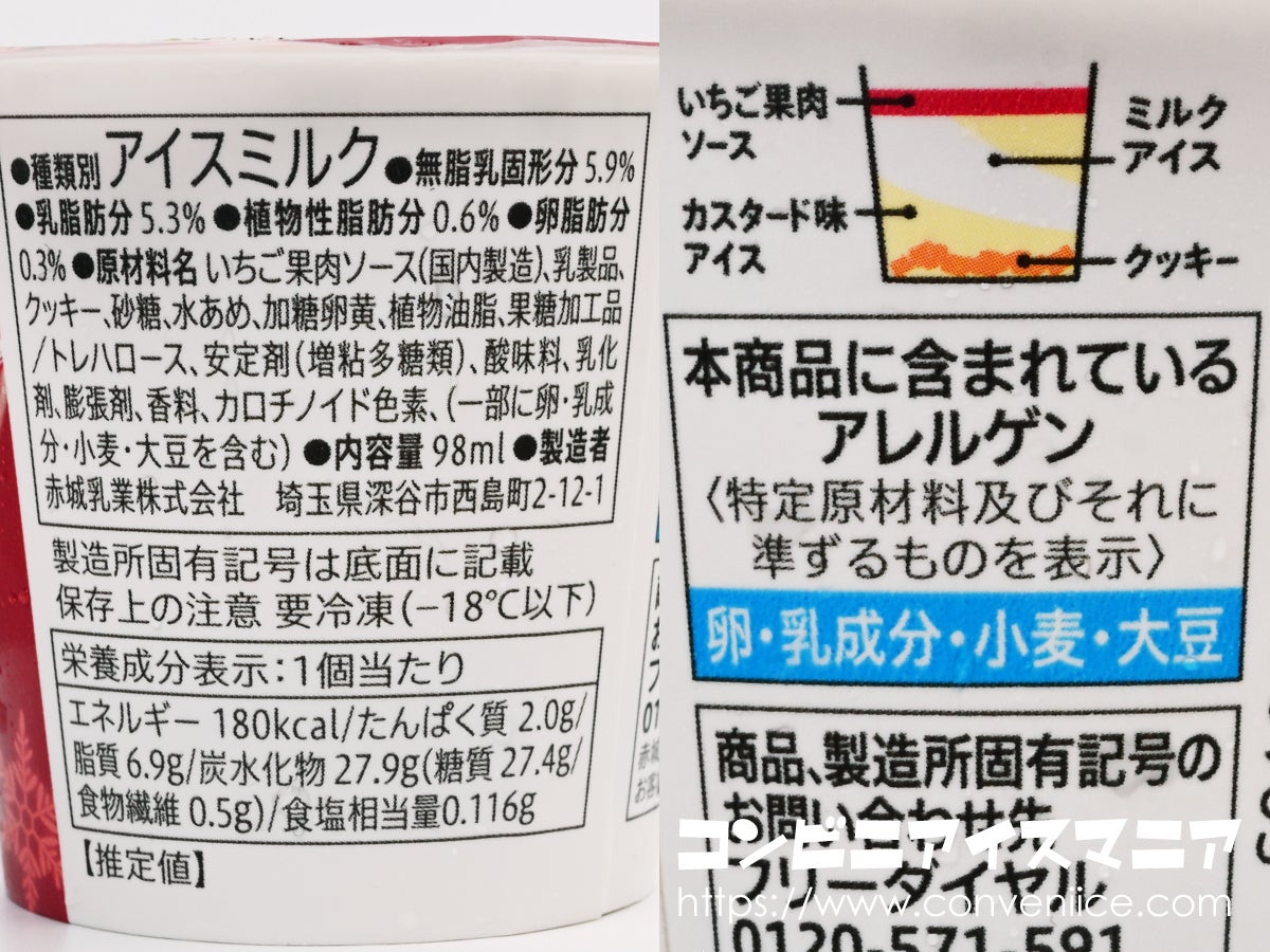 アイスの種類別はアイスミルク規格。ミルクアイスがなめらかでコク深く、まるで生クリームのような風味。この時点で「ショートケーキ」を彷彿とさせますが、さらにスプーンを深く入れると、カスタード味アイスが登場。このカスタード味アイスが濃厚で深い味。ほんのり卵感のある優しい甘みが特徴です。