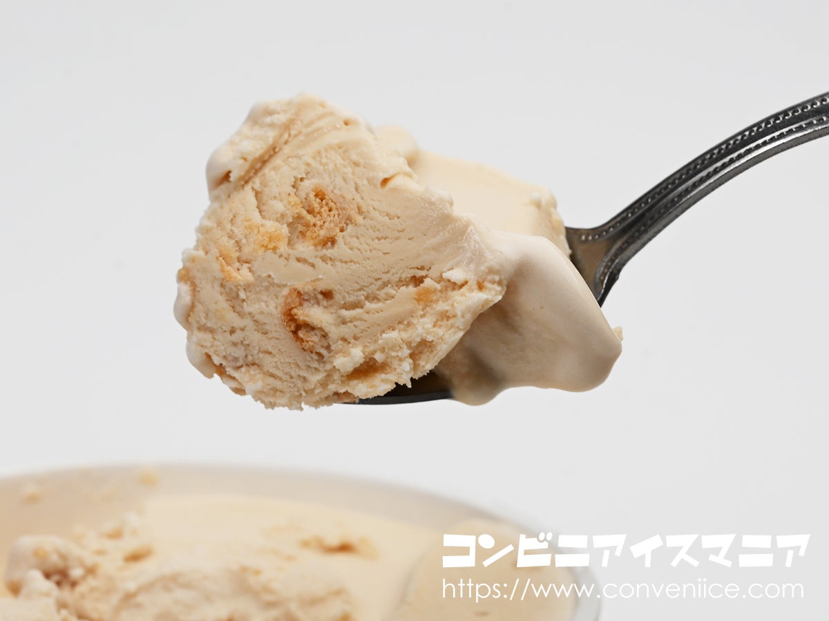 さあ、いよいよ実食。スプーンですくうと、適度な硬さとなめらかさを持つアイスが現れます。スプーンに乗せた状態でじっくり観察すると、ベースアイスの中に小さなきなこ風味のクッキー(クッキー中きなこ2%使用、きなこ香料使用)が点在しているのがよく分かります。