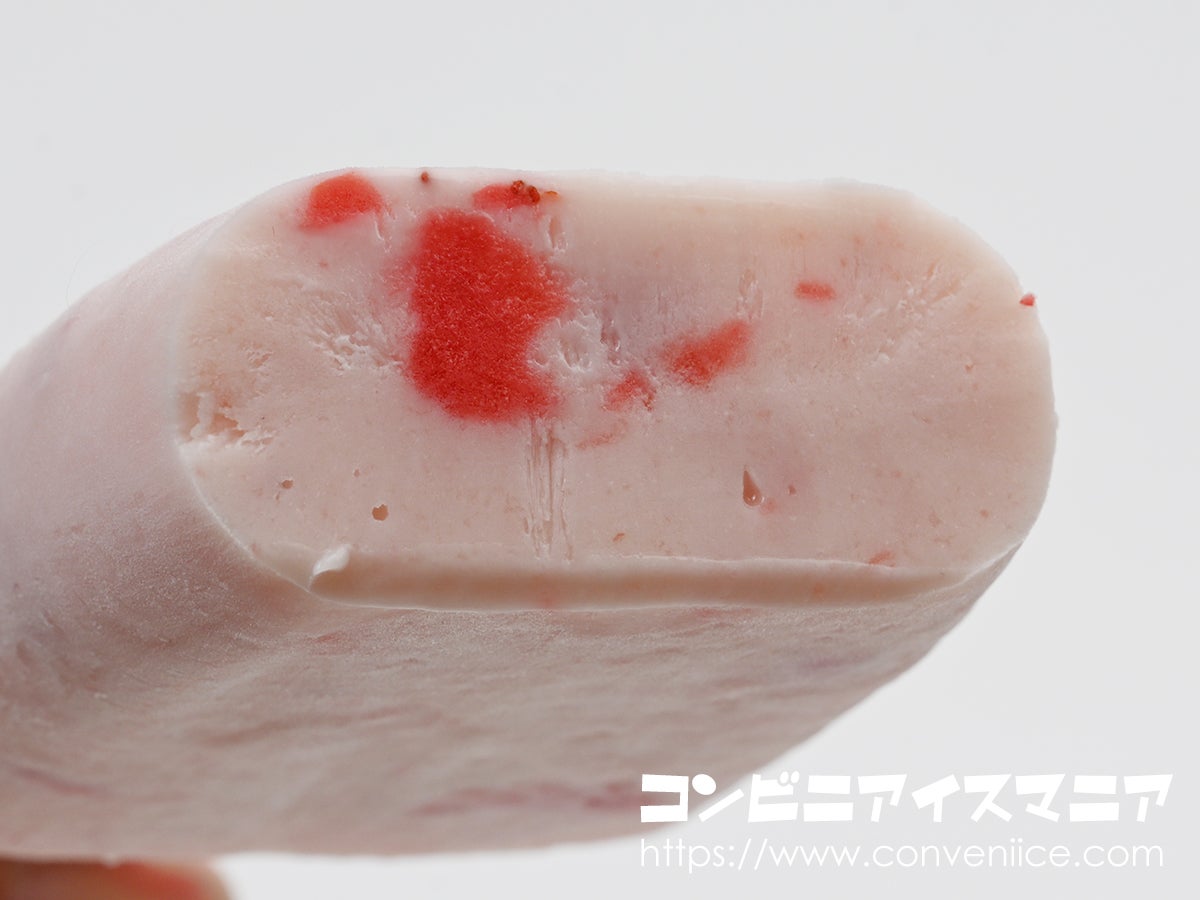 断面を見ると、ミルキーなピンク色の中に大小さまざまな大きさのいちご果肉が。大きめの果肉からほぼ粒状の小さな果肉まで、バラエティ豊かに散りばめられていて、かなり贅沢な配合です。室温に少し置いておくと表面が溶け始め、いちごの甘い香りが漂ってきます。