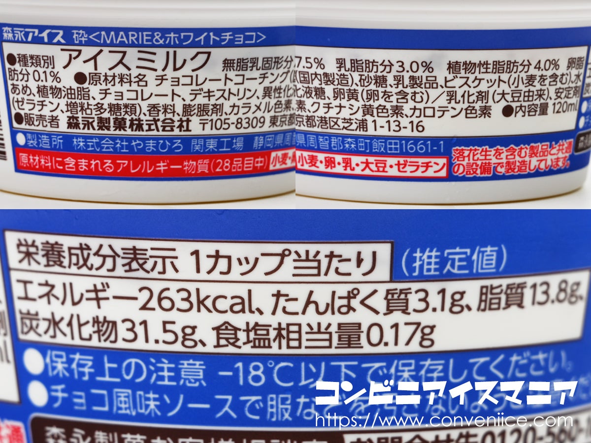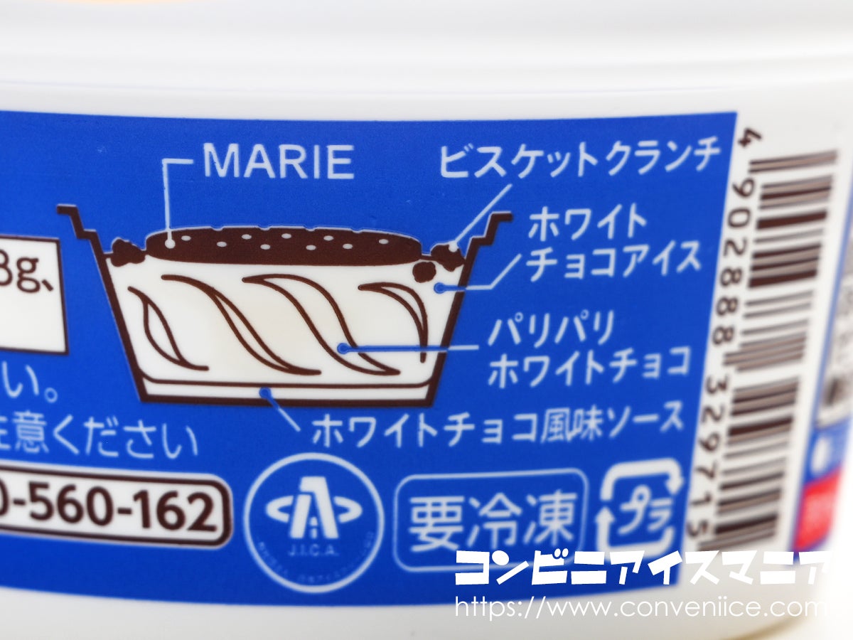 カップ側面には、このアイスの構造がイラストで丁寧に解説されています。単にビスケットをトッピングしただけではなく、ホワイトチョコアイスの中間層にはパリパリのホワイトチョコ、下層部にはホワイトチョコ風味ソースという多層構成。森永製菓がお菓子製造で培った技術が、ここでも光っています。