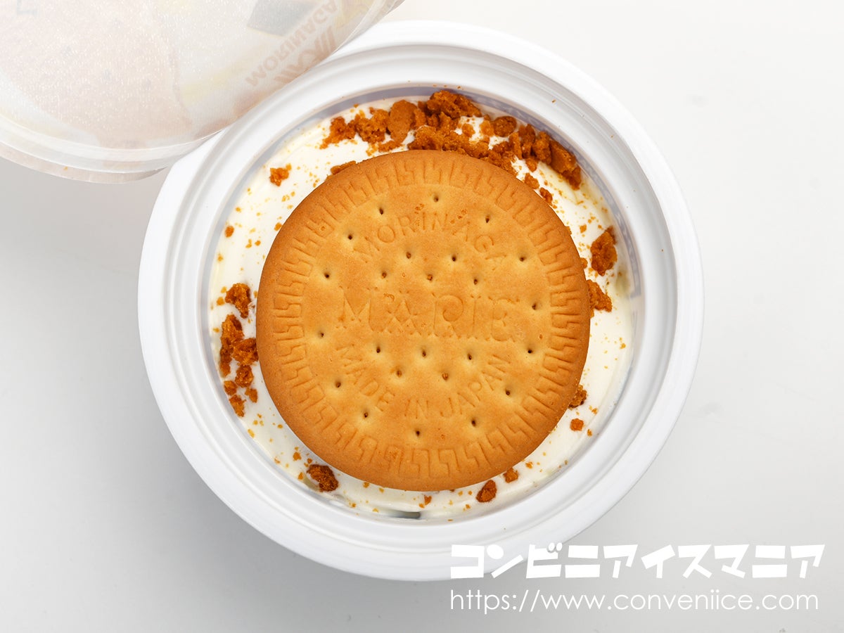 フィルムを開けると、天面にはMARIEビスケットが一枚、まるごと鎮座。その周囲には細かく砕かれたビスケットクランチがたっぷりと散りばめられ、このビジュアルだけでスイーツファンの心をわしづかみ。まさにご褒美アイス!