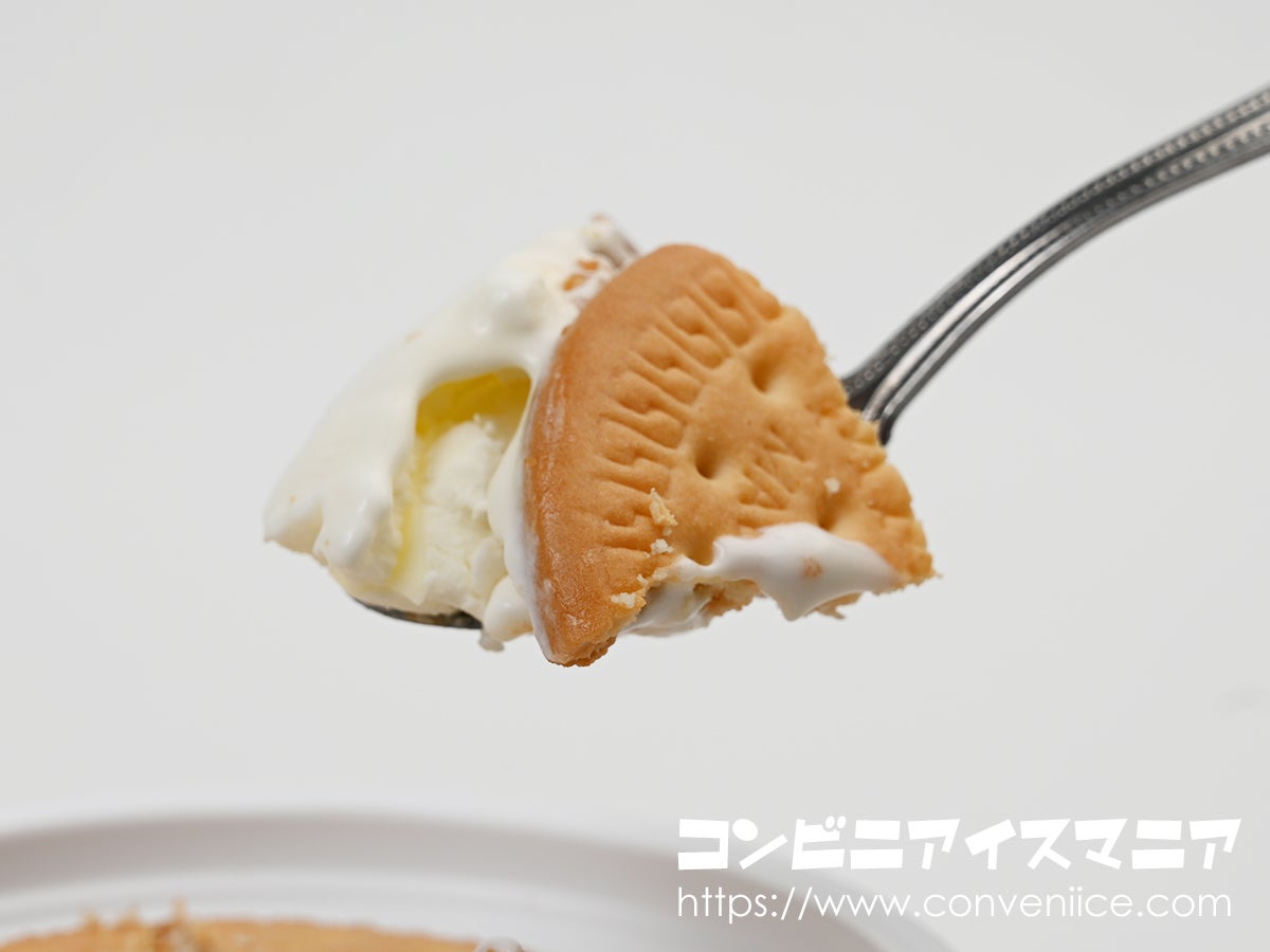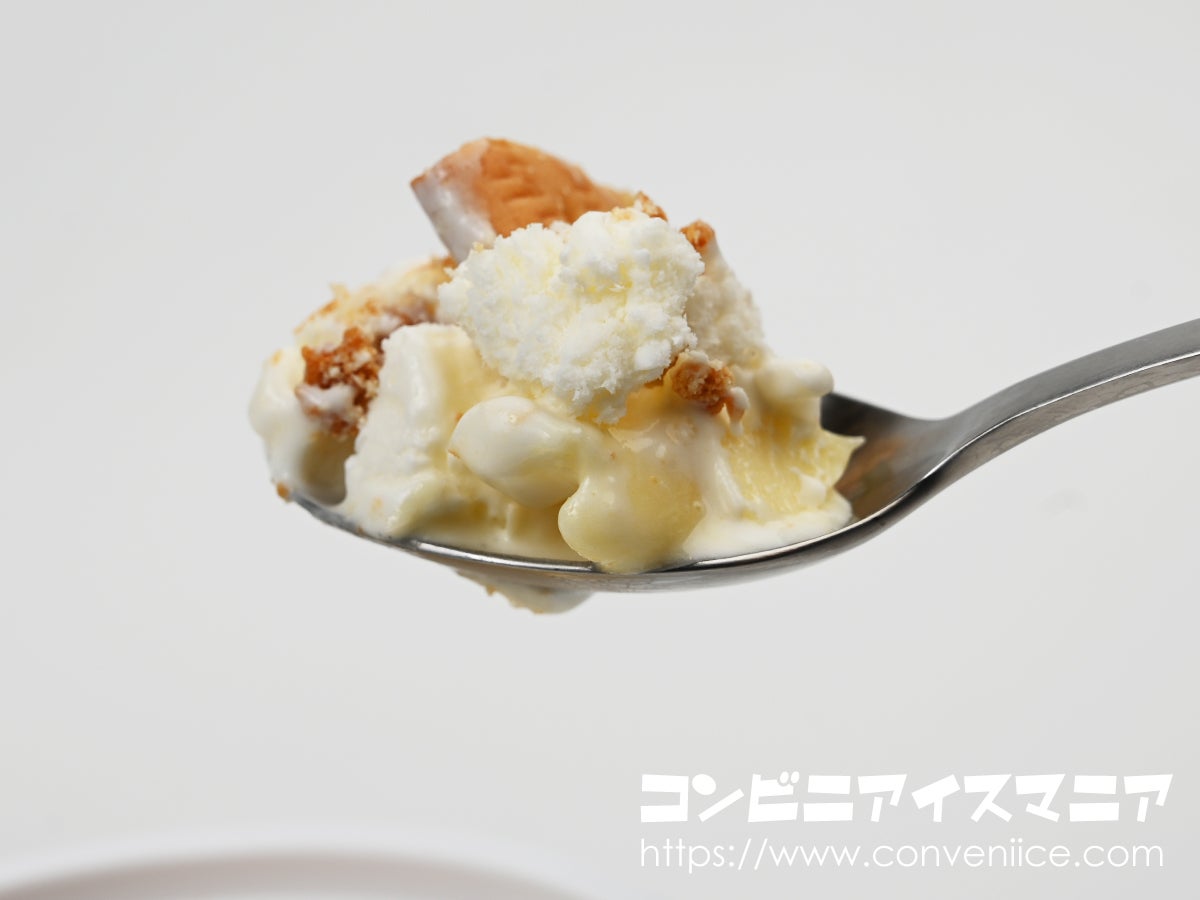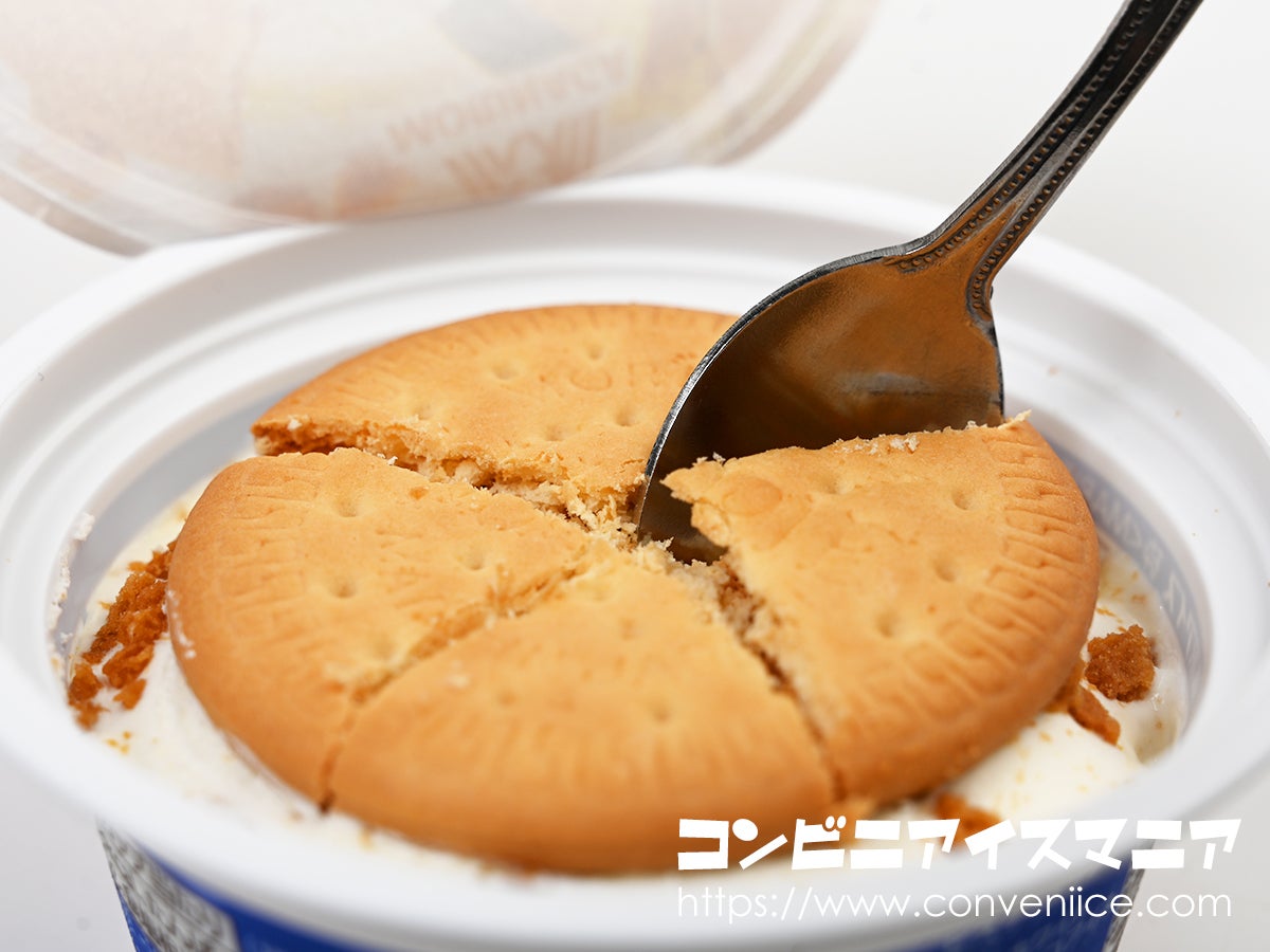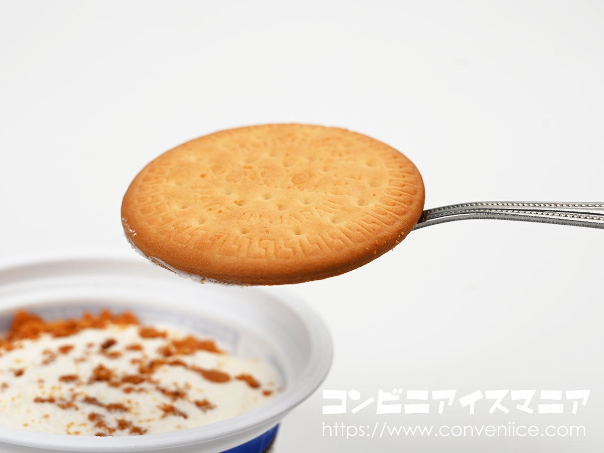 砕いたMARIEビスケットと、表面に散りばめられたクランチビスケットの二重の食感がまず楽しめます。程よく溶けかけたアイスと一緒にすくえば、まるでビスケットをミルクに浸して食べているような、どこか懐かしい美味しさが楽しめます。MARIEの安定した素朴な風味は、幼い頃からの記憶を呼び起こしてくれます。