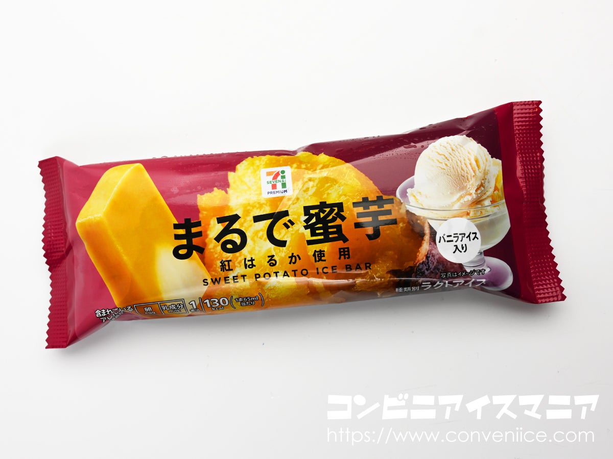 セブンプレミアム“まるで”シリーズはまるで本物の果実を食べているかのような味わいと食感を楽しめるアイスバー。2013年頃から展開するシリーズです。代表作である「マンゴー」「キウイ」をはじめ数多くのフレーバーを展開。今回は、今の季節にぴったりな蜜芋が登場!