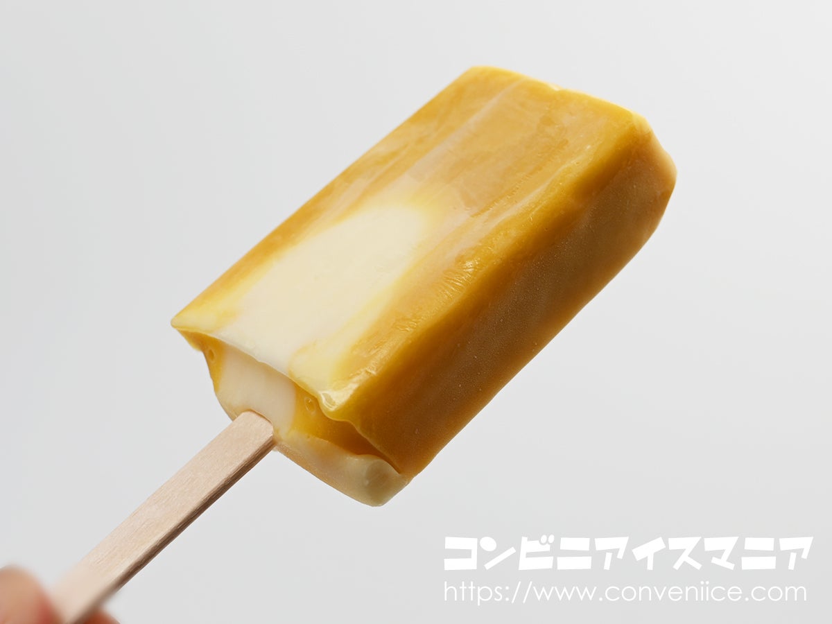 内容量は65mlで、アイスバーとしてはやや小ぶり。ひと昔前の数本入りの箱(マルチ)タイプのアイスバーと同じくらいのサイズ感でしょうか。小ぶりではありますが、手に取ってみるとずっしりとした重みがあり、その濃密さが伝わってきます。