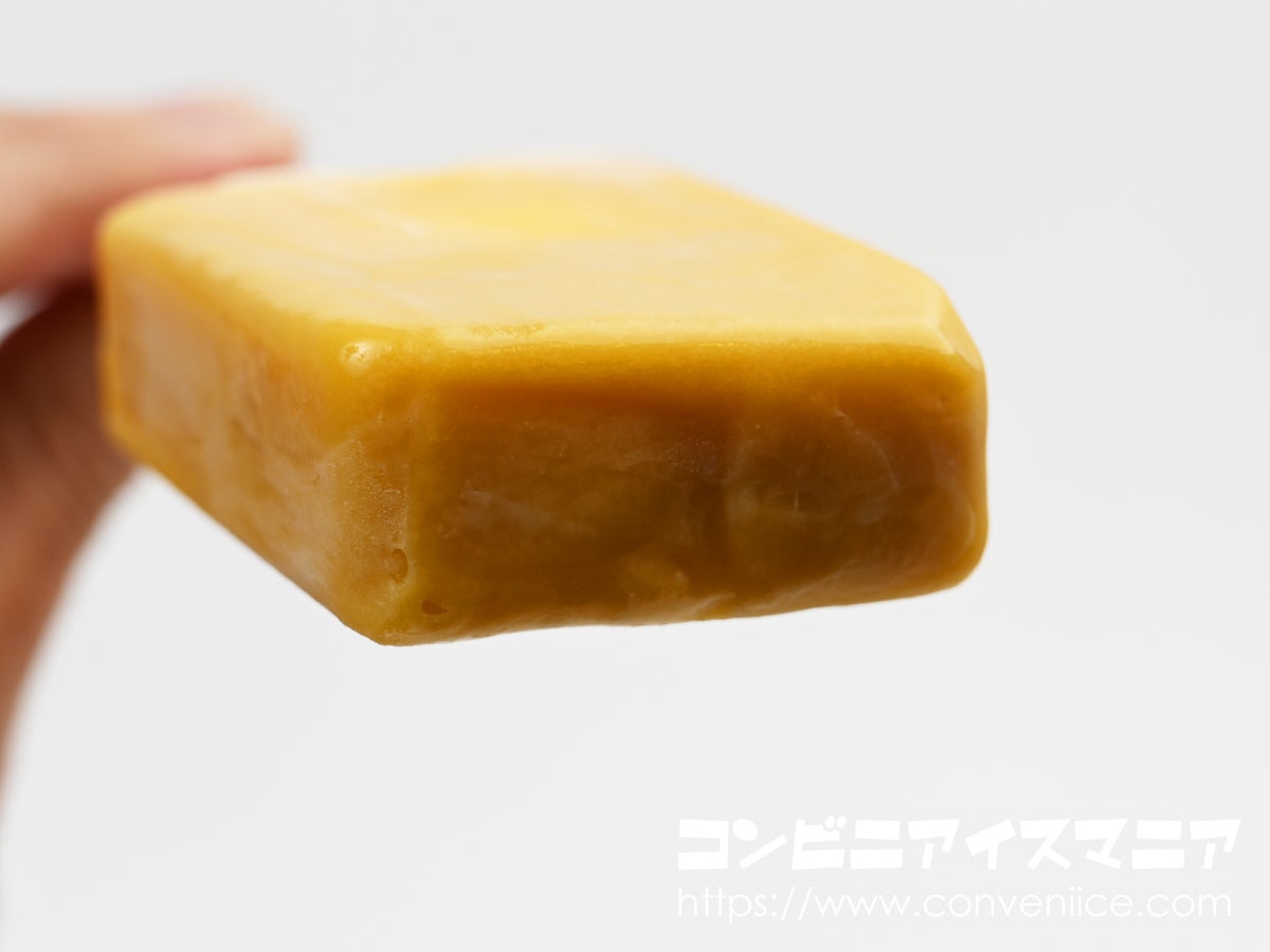 紅はるかを100%使用した焼き芋アイスは黄金色で、表面には焼き芋特有のしっとりとした質感が再現されており、まるで本物の蜜芋を凍らせたかのようなリアリティがあります。光の当たり具合によっては、うっすらと焼き目のような濃淡も感じられます。