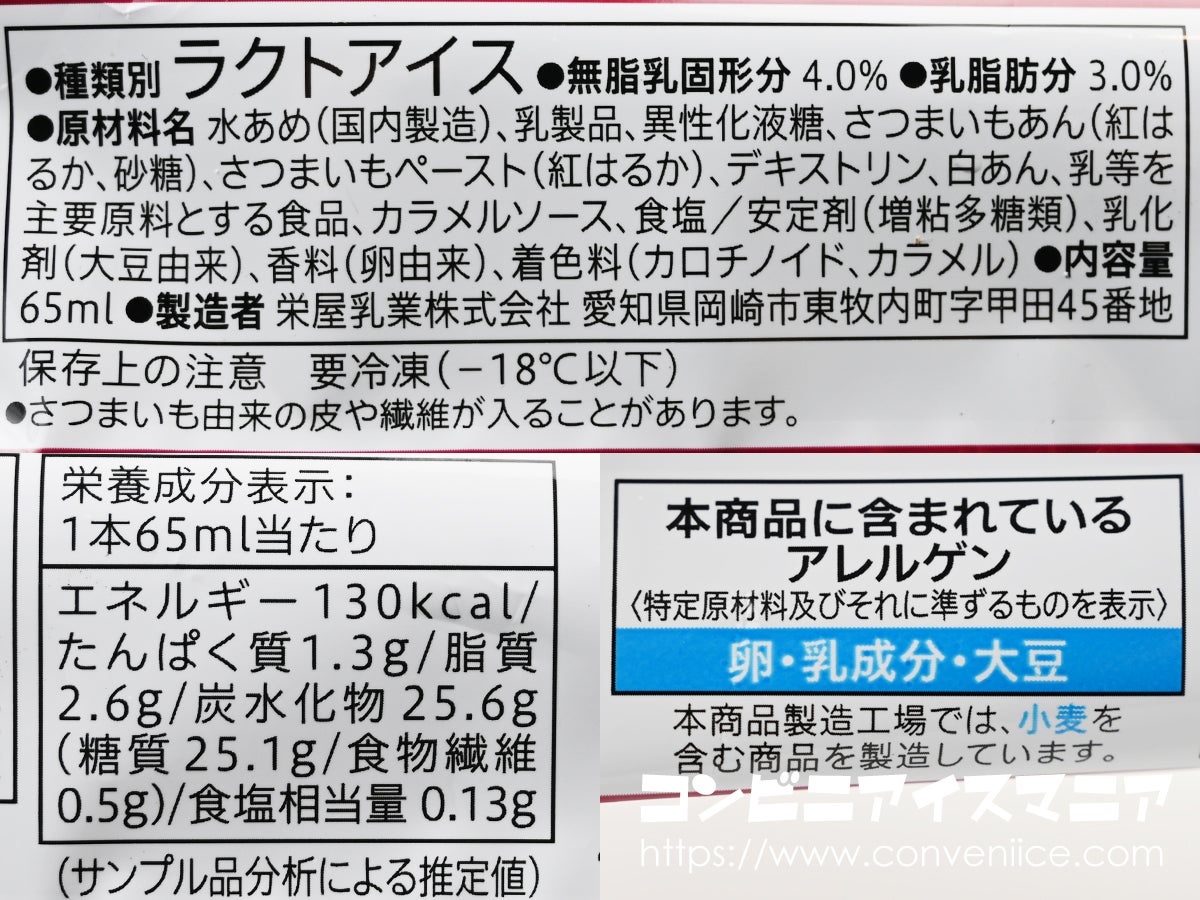 種類別はラクトアイス規格。製造を担当するのは「アンデイコ」ブランドでおなじみの栄屋乳業株式会社。愛知県岡崎市に拠点を置く同社は、セブンプレミアムとのタッグで「まるで」シリーズを長年手掛けてきた実績を持つ製造メーカーです。フルーツ系や食感にこだわったアイス製造に定評があり、ねっとりとした質感や果汁感を活かした商品開発を得意としています。今回の『まるで蜜芋』でも、その技術力がいかんなく発揮されており、紅はるかの濃厚な味わいを損なうことなくバニラとの絶妙なバランスを実現しています。