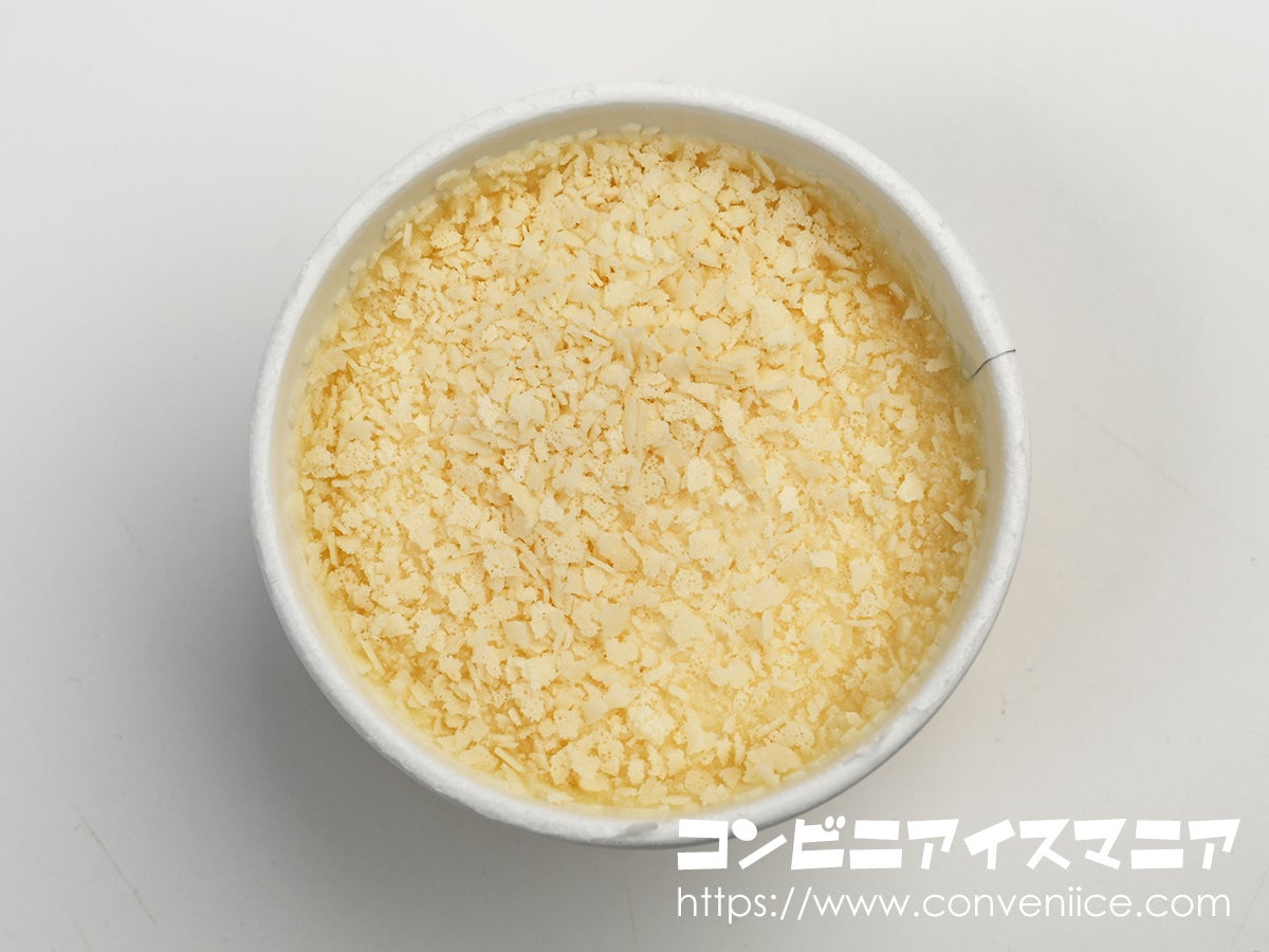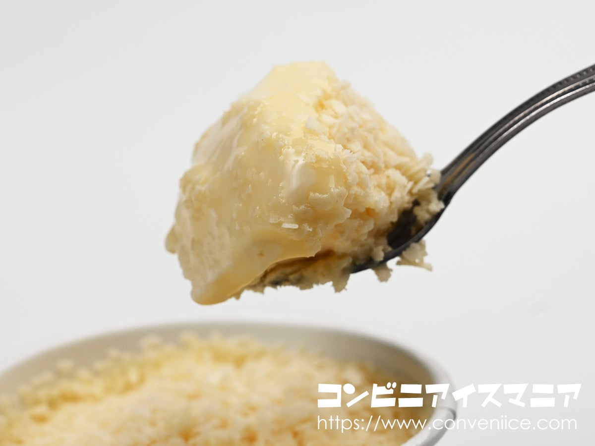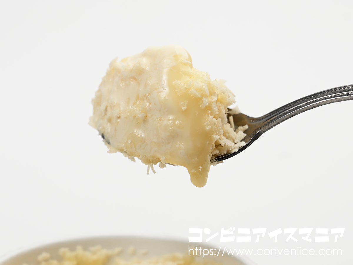 ホワイトフィアンテーヌの下には、とろーり食感が楽しめるミルクコーティング層。スプーンを入れると、まず表層のフィアンテーヌとミルクコーティングが一体となります。一口食べると、フィアンテーヌのサクサク感とミルクコーティングのとろける感触が舌の上で絡み合います。通常は硬いコーティングでアイスとトッピング層の境界をつくりますが、本品はやわらかいミルクコーティング層を採用。それでいてフィアンテーヌのサクサク感がしっかりと保たれているのは驚きです。