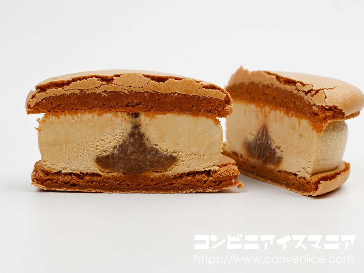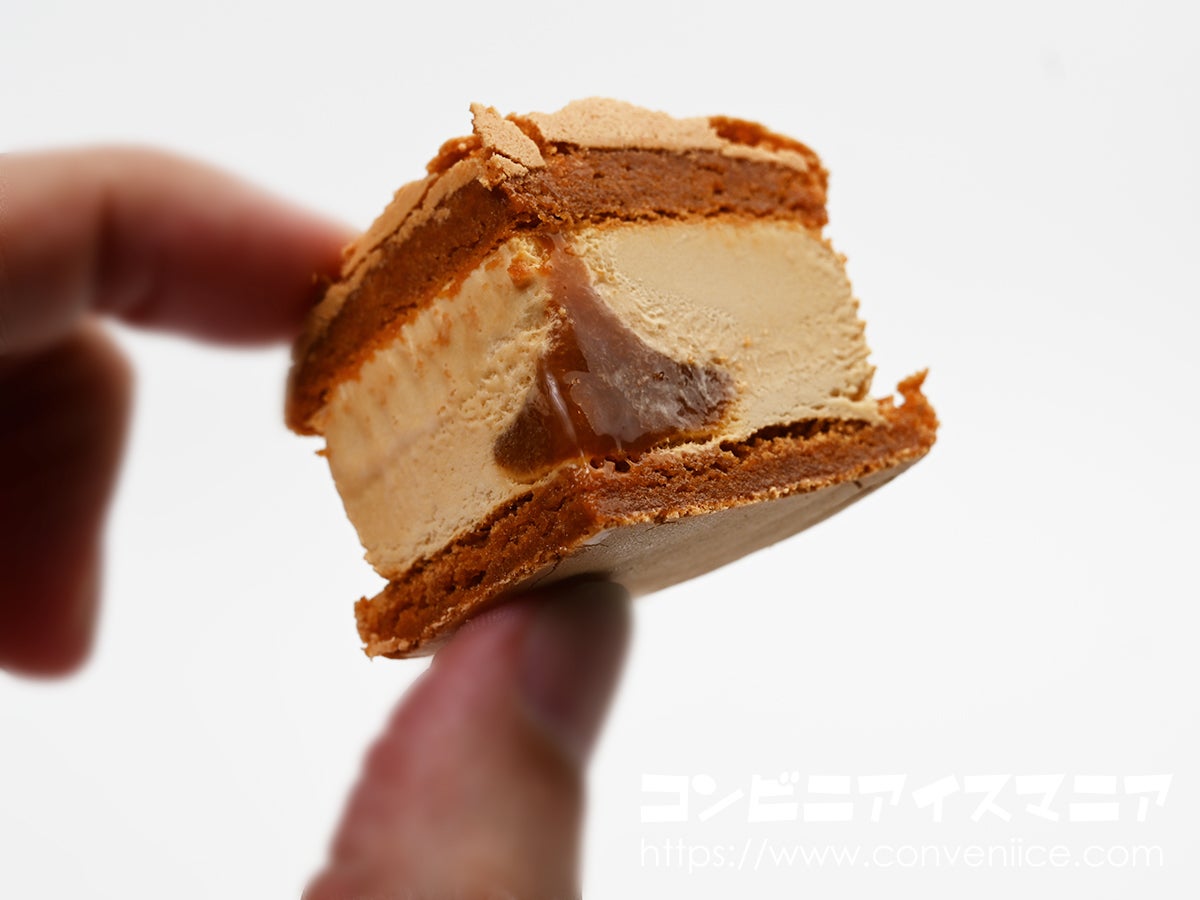 断面は、キャラメル色のマカロン生地に挟まれたビターキャラメルアイス、中心部には茶色い生キャラメルソースがとろり。キャラメルづくしの三層構造です。