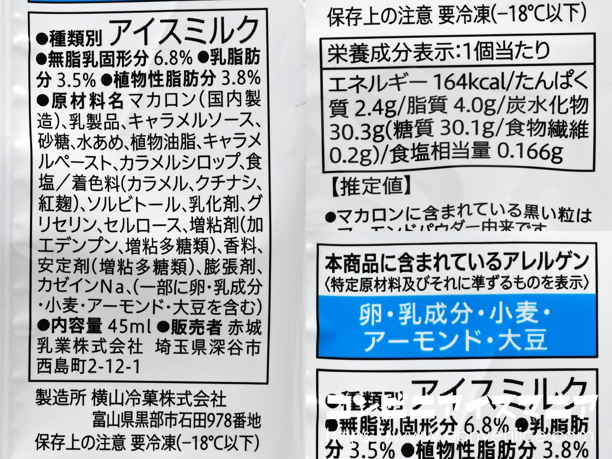 販売者はおなじみの赤城乳業。製造所は富山県の横山冷菓が担当。横山冷菓は地域に根ざした冷菓メーカーで、高速道路のSAなどで商品を良く見かけます。細やかな製造技術が求められるマカロンアイスのような商品にも対応できる実力を持っています。