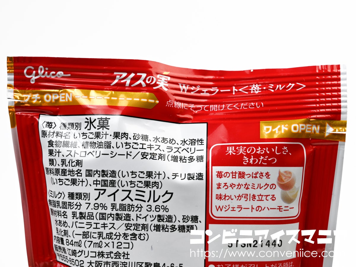 上部中央には「アイスの実」のロゴ。今回から1袋2種類仕様に対して「Wジェラート」というシリーズ名が付きました。その下には「苺」「ミルク」のフレーバー表示も。