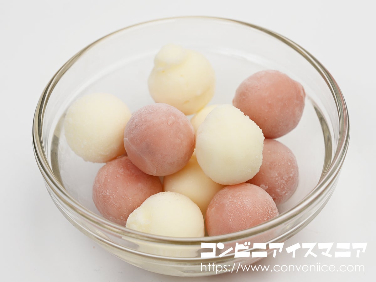 袋を開けると、淡いピンク色の苺ジェラートと白色のミルクジェラートが混ざり合って出てきます。