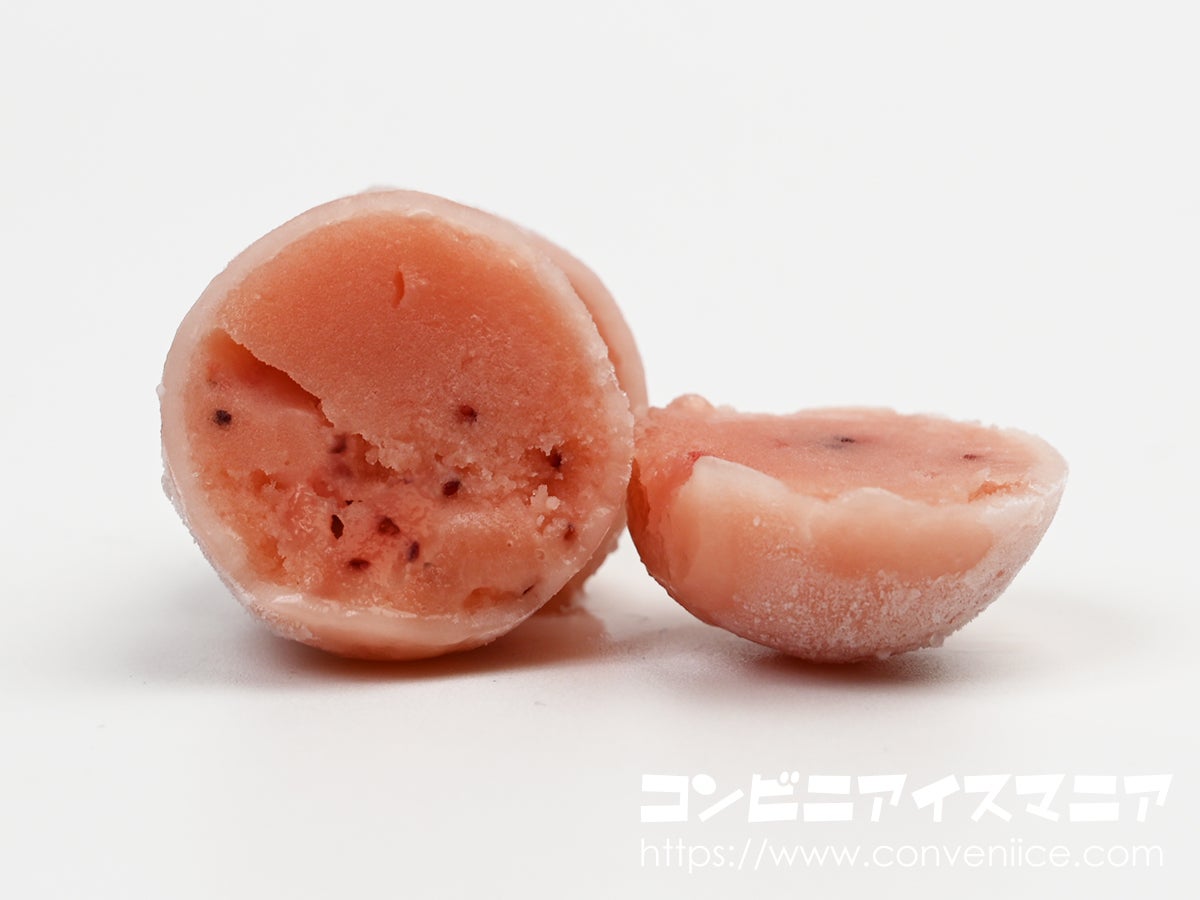 苺ジェラートを半分に割ってみると鮮やかなピンク色のジェラートの中に苺の種(つぶつぶ)がしっかりと入っているのが見えます。まさに「つぶつぶ食感の苺果肉を練り込んだ」という商品説明通りの仕様。