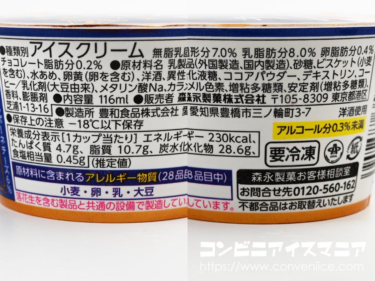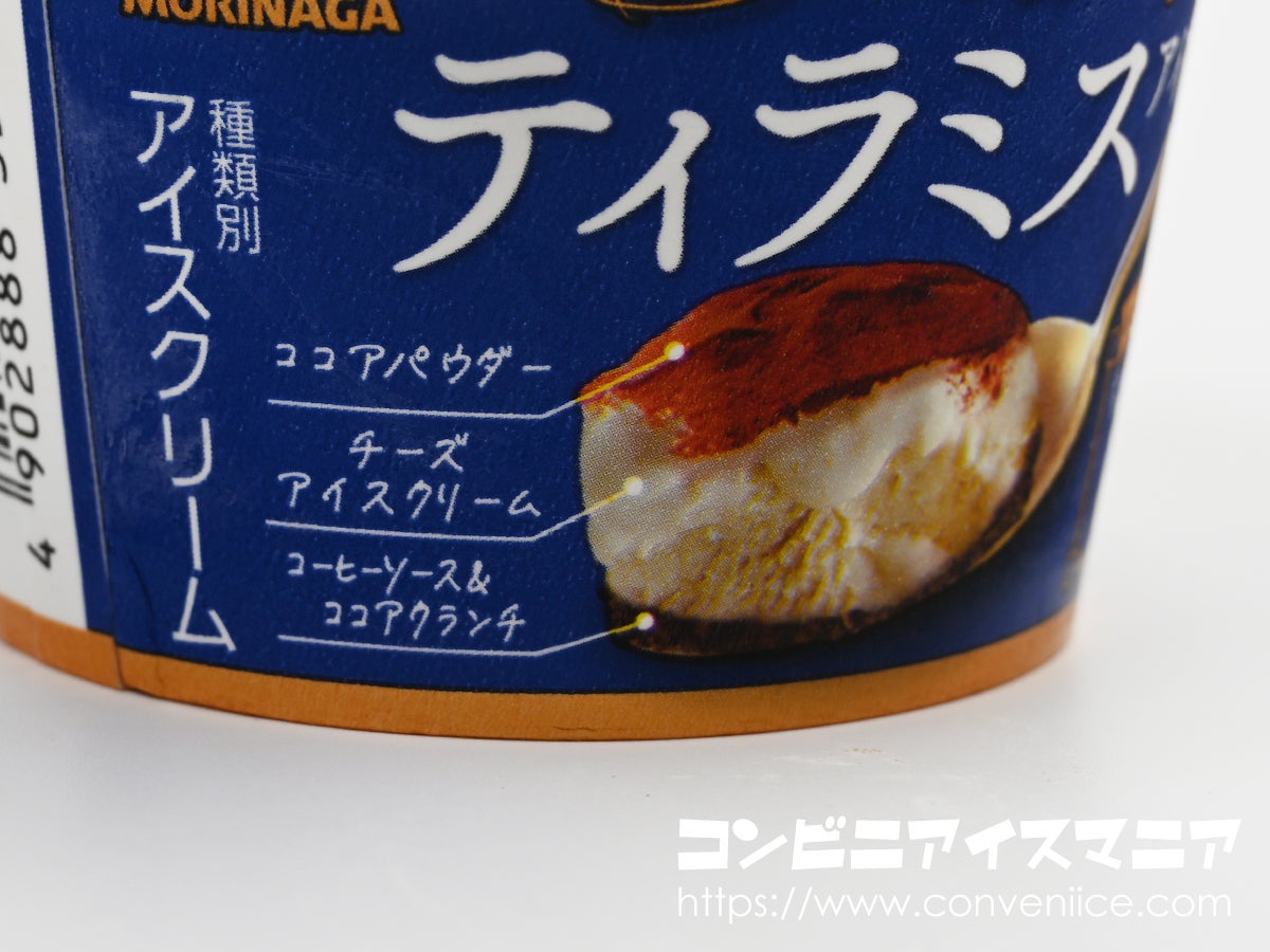 同カテゴリだと、井村屋の『KASANEL ティラミスアイス』が90ml、セブンプレミアムの『ティラミス氷』が155mlですから、ちょうどその中間に位置するボリューム。濃厚な味わいの本商品にとって、116mlという容量は食べ切るのに程よく満足感も十分に得られる絶妙なサイズ設定といえます。カップの側面には分かりやすい構造説明も。