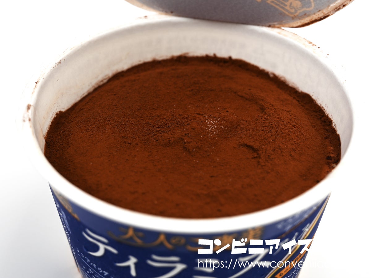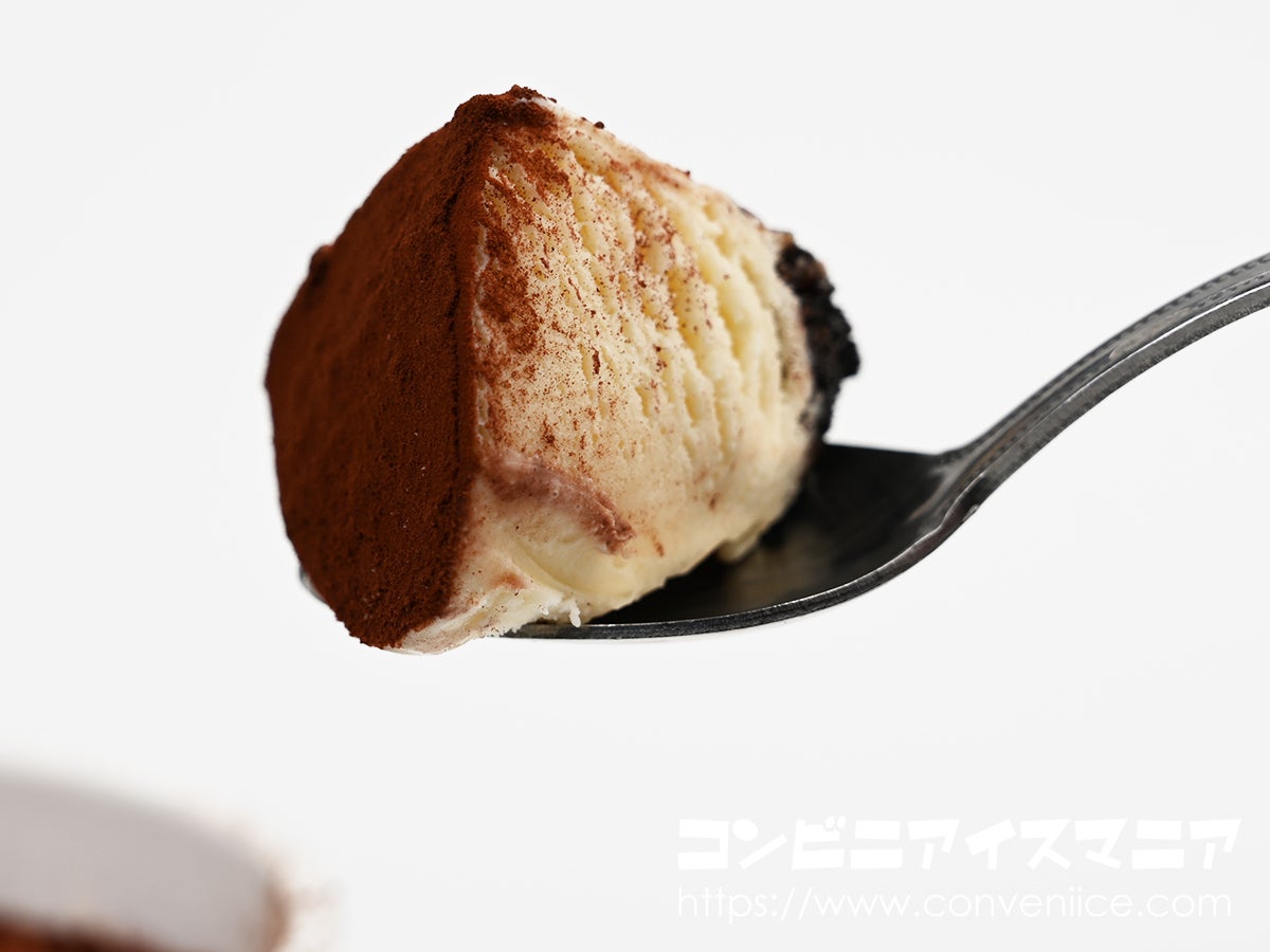 蓋を開ける際は要注意。蓋にも赤字で「ココアパウダーがかかっています」という警告表示がありますが、これは決して大げさではありません。表面全体にココアパウダーがたっぷりと敷き詰められており、勢いよく開けると粉が舞い上がってしまうのでご注意を。ゆっくりと蓋を持ち上げると、一面のココアパウダー。細かなパウダーが均一に振りかけられ、まるで本物のティラミスを目の前にしているような錯覚を覚えます。スプーンを入れると、サラサラとしたパウダーが崩れ、その下からチーズアイスクリームが姿を現します。