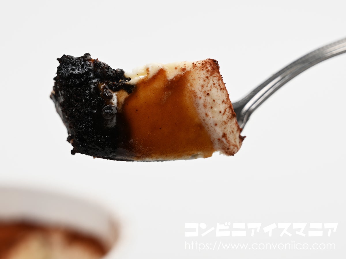 冷凍庫から出したばかりの状態でひと口。まず感じるのは、ココアパウダーの上質な苦み。砂糖の甘さとは対極にある、カカオ本来の深い苦みが感じられます。その直後、マスカルポーネチーズアイスクリームの濃厚なコクが広がります。甘さは控えめで、むしろチーズ本来のまろやかな味わいが前面に出ています。