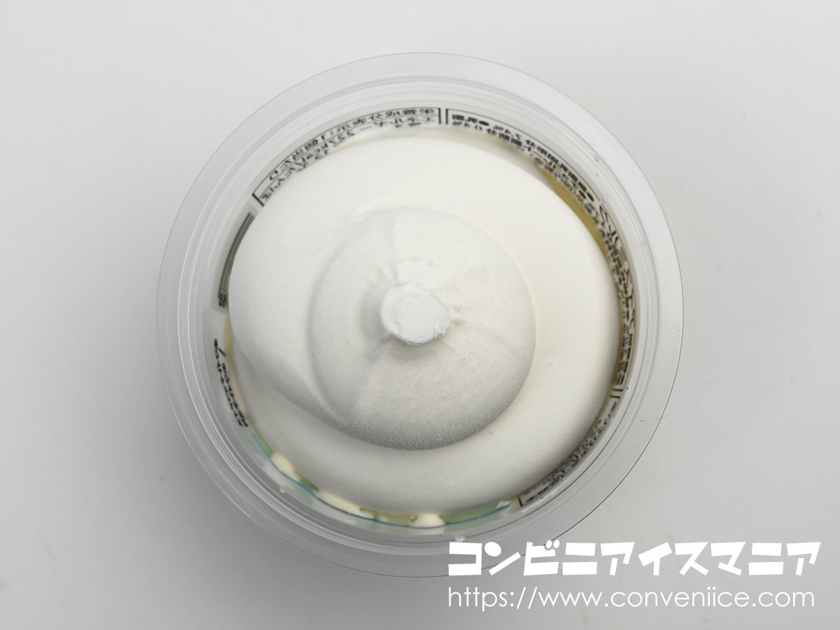 蓋を開けると、まさに「まっしろもこもこ」の名前どおり、真っ白なアイスが山のように盛り上がっています。まるでもこもこの太巻きソフトクリームのトップ部分だけを切り取ったかのような、ふんわりとした佇まい。
