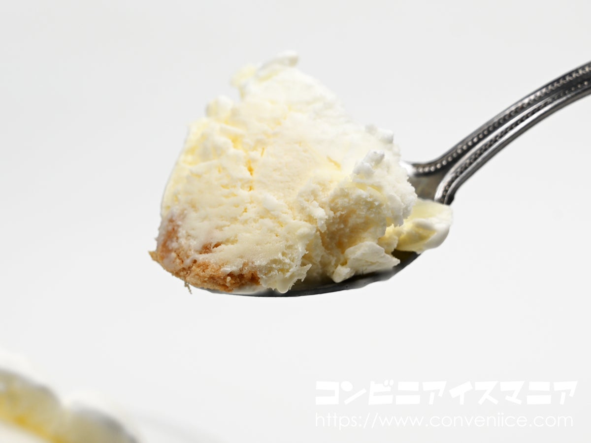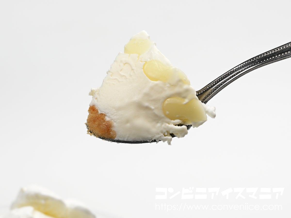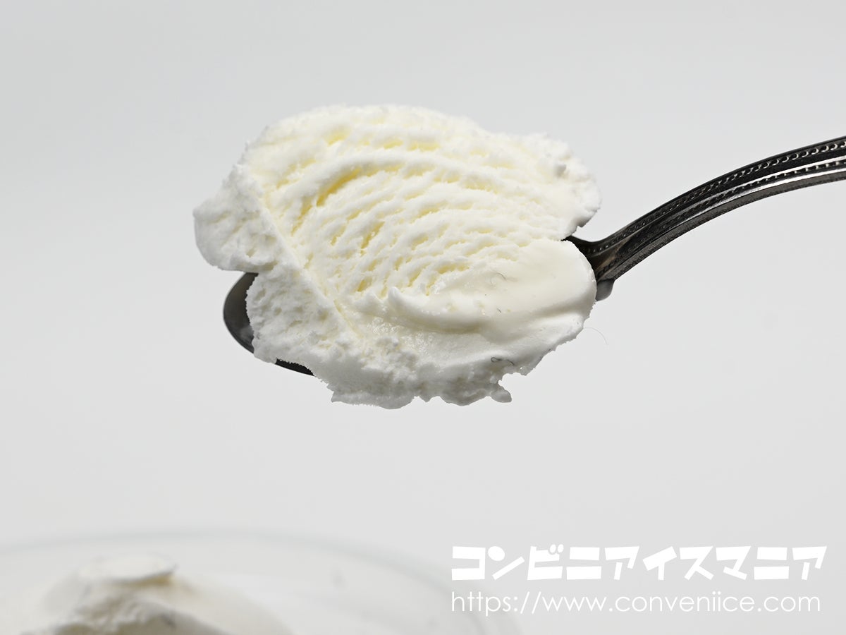 スプーンを入れると、想像以上にふわっとした感触!軽やかでエアリーな質感です。食べてみるとホワイトチョコアイスのミルキーな甘さが口いっぱいに広がります。ふわっと軽いのに、しっかりとしたコク。アイスの種類別はアイスミルク規格。ミルキーでリッチな味わいです。