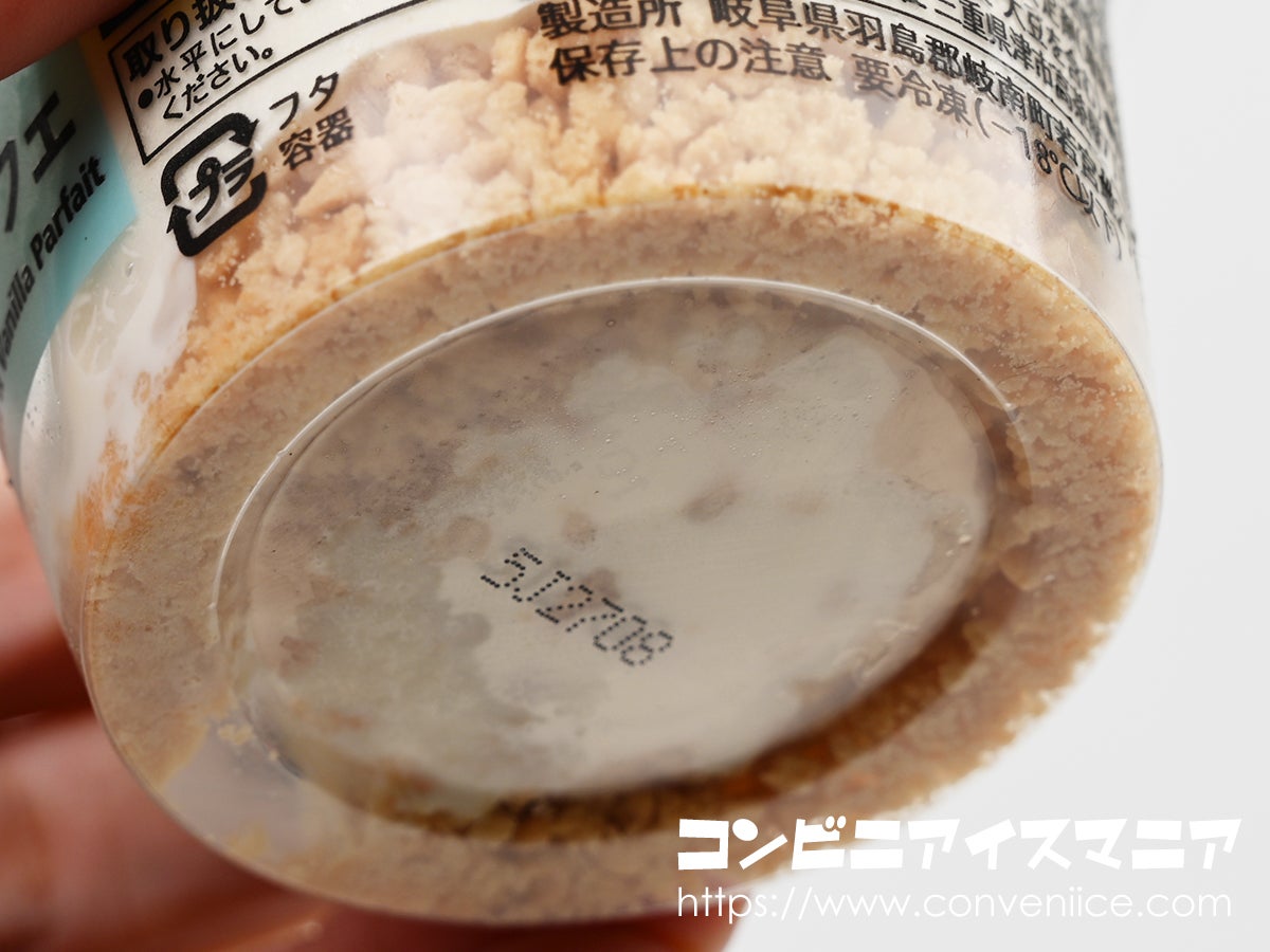 パフェグラスを模したイラストも可愛らしく、「White Chocolate & Vanilla Parfait」の英字表記がちょっとした高級感を添えています。