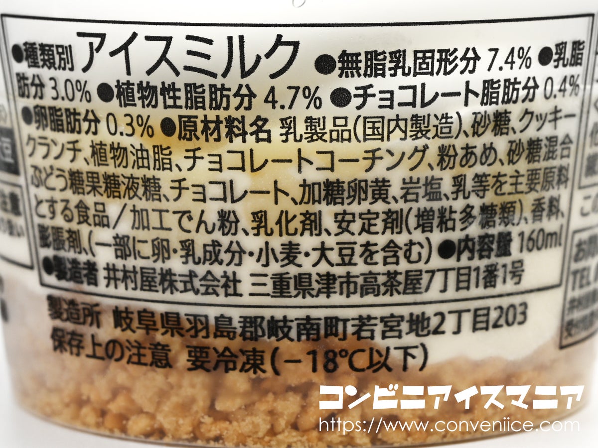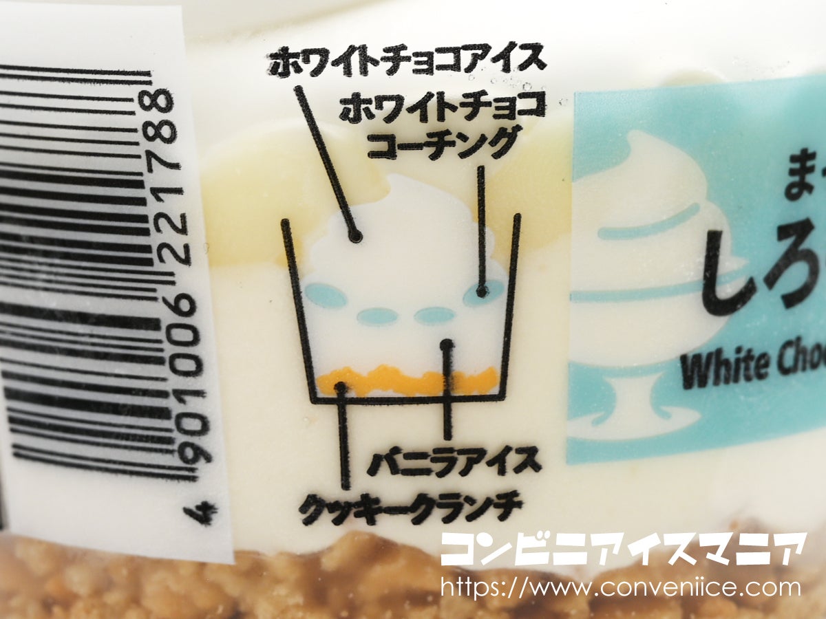 側面には4層構造を図解したイラストが描かれており、上から「ホワイトチョコアイス」「ホワイトチョココーティング」「バニラアイス」「クッキークランチ」という構成が一目でわかる親切設計。