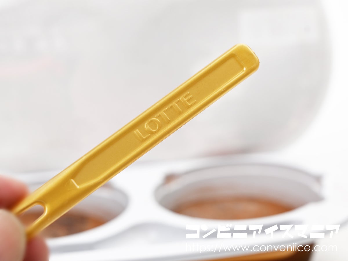 付属のフォークはゴールド仕様で、「LOTTE」の刻印がさりげなく高級感を演出。このサイズ感と装飾からも、商品が「大人の贅沢」にフォーカスしていることが伺えます。