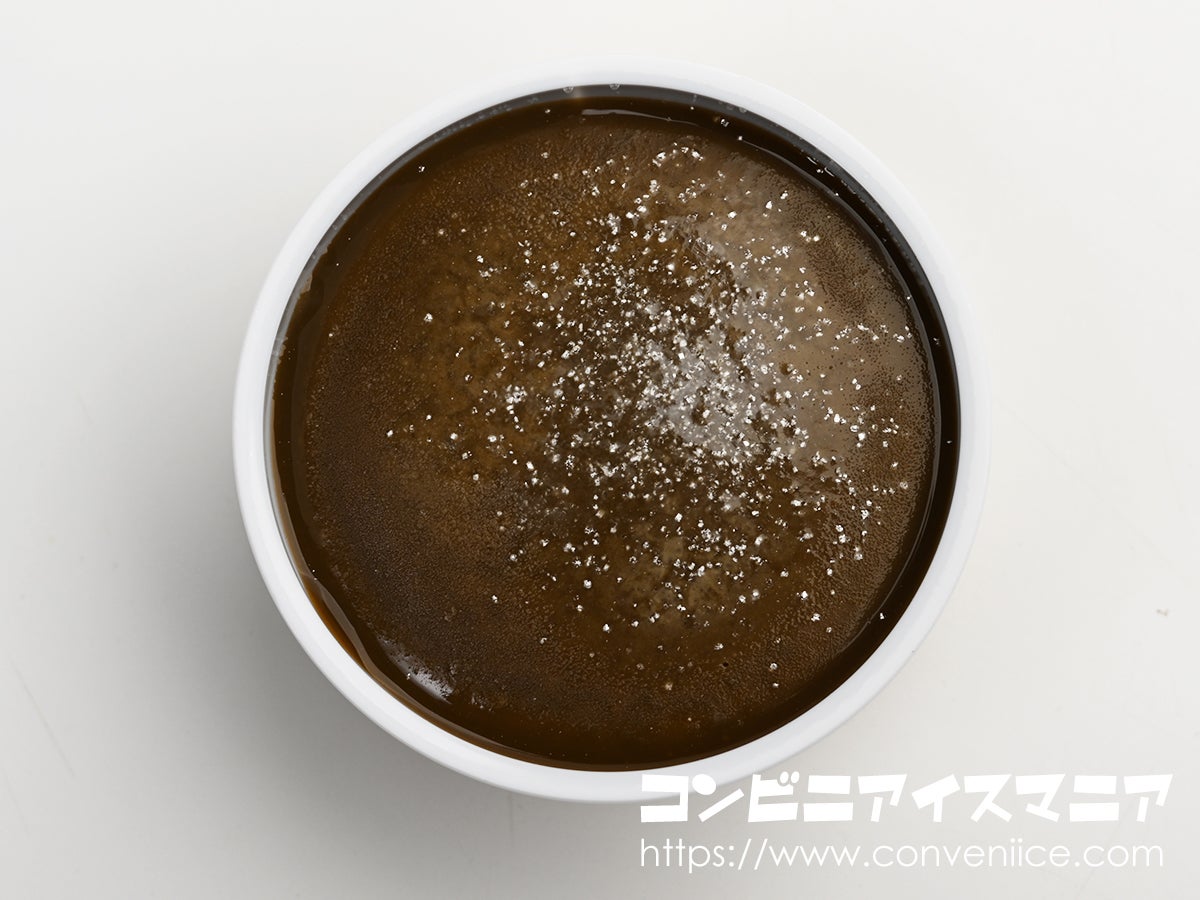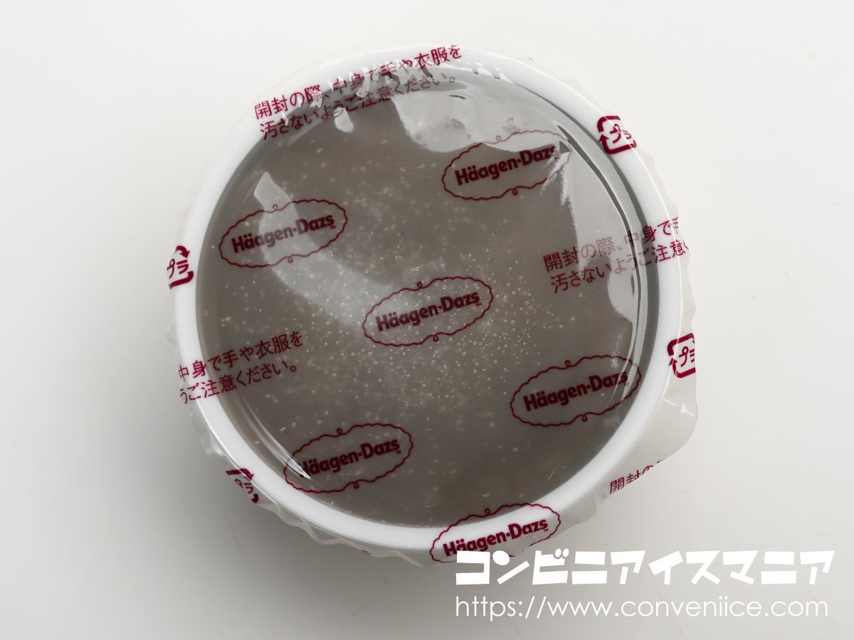 内蓋(タンパーエビデンス)はハーゲンダッツのブランドロゴ入り透明フィルム。フィルム越しに、すでに茶褐色のソース&銀粉がうっすらと見えます。