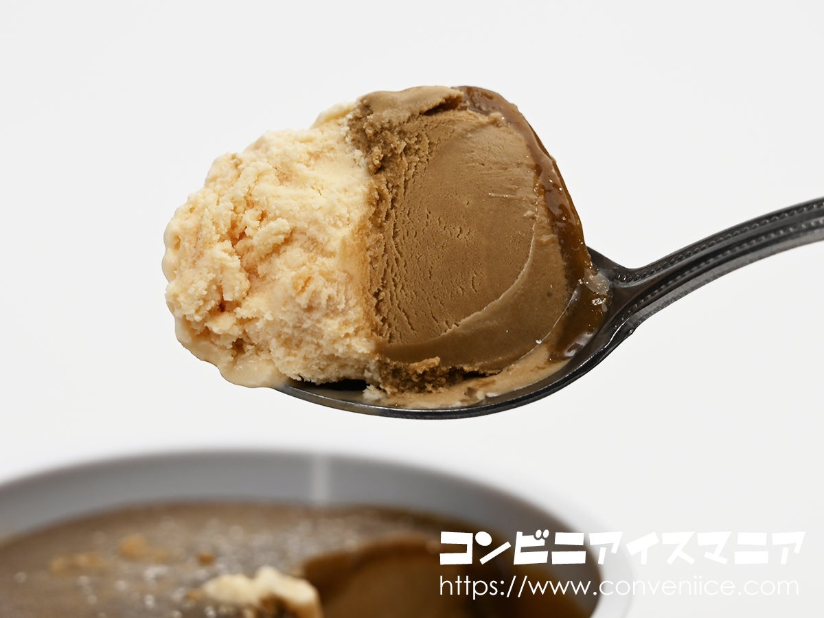 三層を一緒にすくって食べると、これがまた絶妙。和紅茶の華やかさ、ミルクティーソースのまろやかさ、バタークッキーの香ばしさが三位一体となって、口の中で複雑な味わいのハーモニーを奏でます。まさに「バタークリームケーキ」の味。これはシンプルなアイスクリームでは味わえないスイーツ仕立てならではの贅沢と言えます。食べ進めるごとに変化する味わいも楽しい。上から順に食べれば紅茶の繊細さからバターのリッチさへ。混ぜて食べれば一体感のある贅沢なミルクティーケーキ。「自分好みの食べ方」を探る楽しさもこのアイスクリームの魅力です。