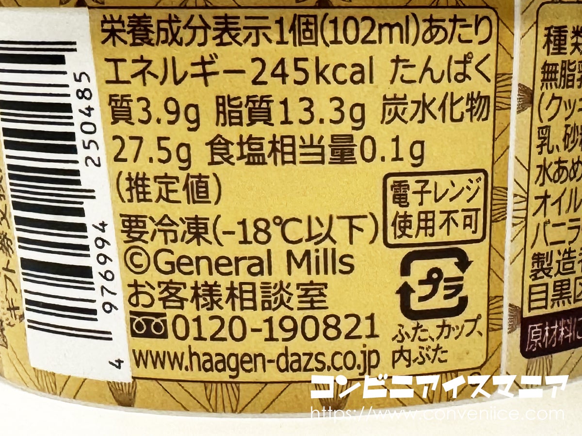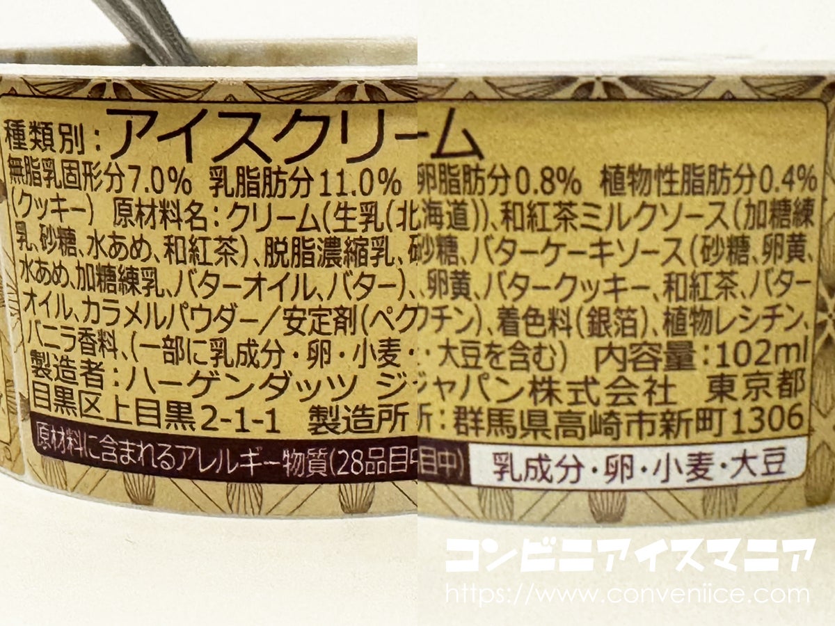 原材料の筆頭には「クリーム(生乳(北海道))」の文字。ハーゲンダッツが誇る北海道産の乳材料が、このアイスクリームの土台を支えています。乳脂肪分11.0%、種類別は最高グレードの「アイスクリーム」。