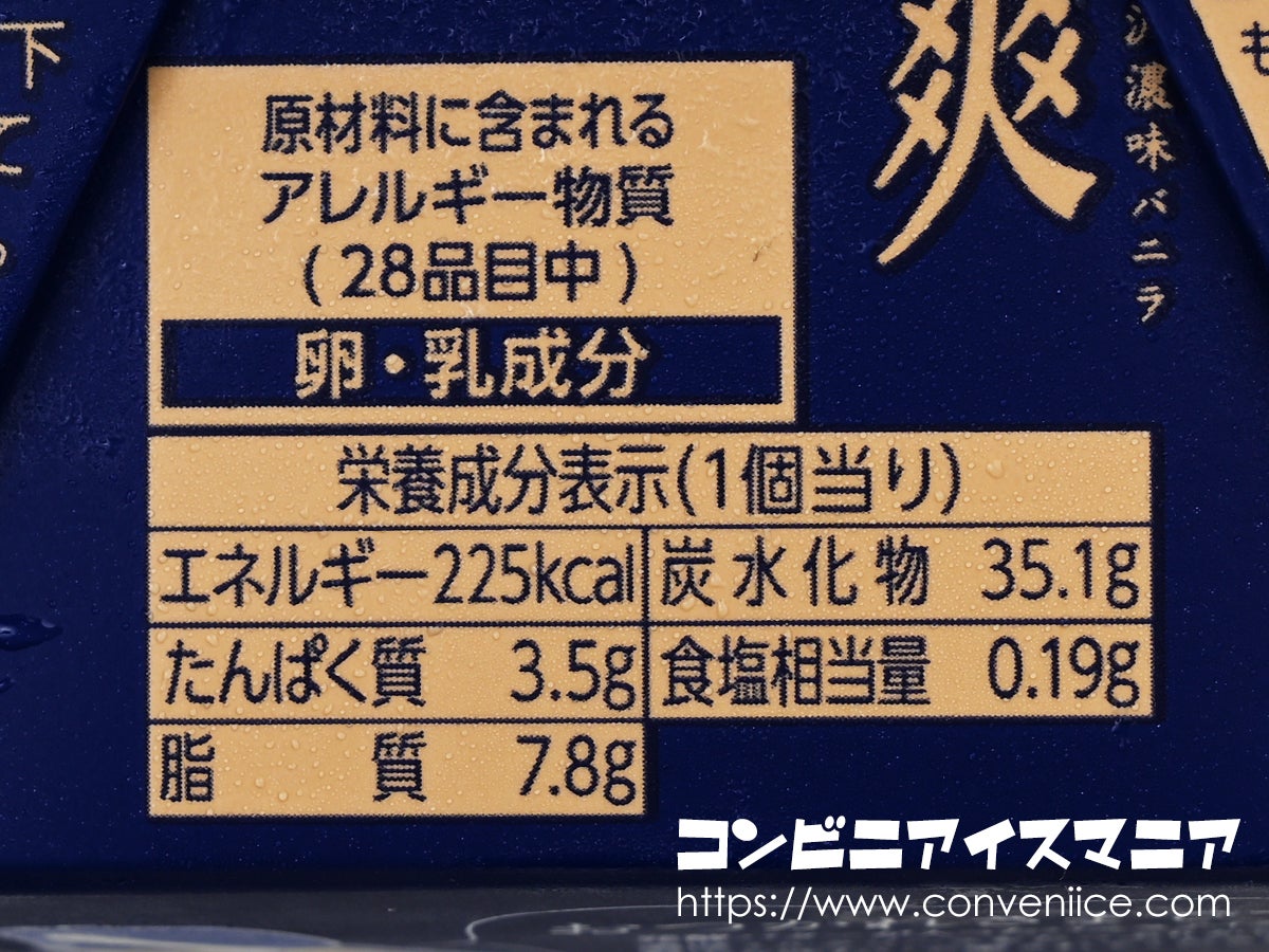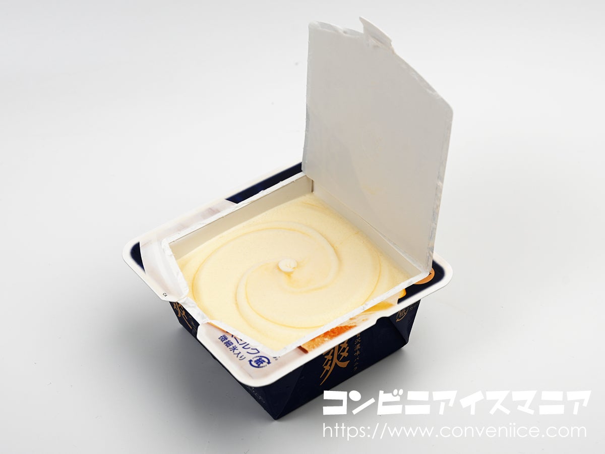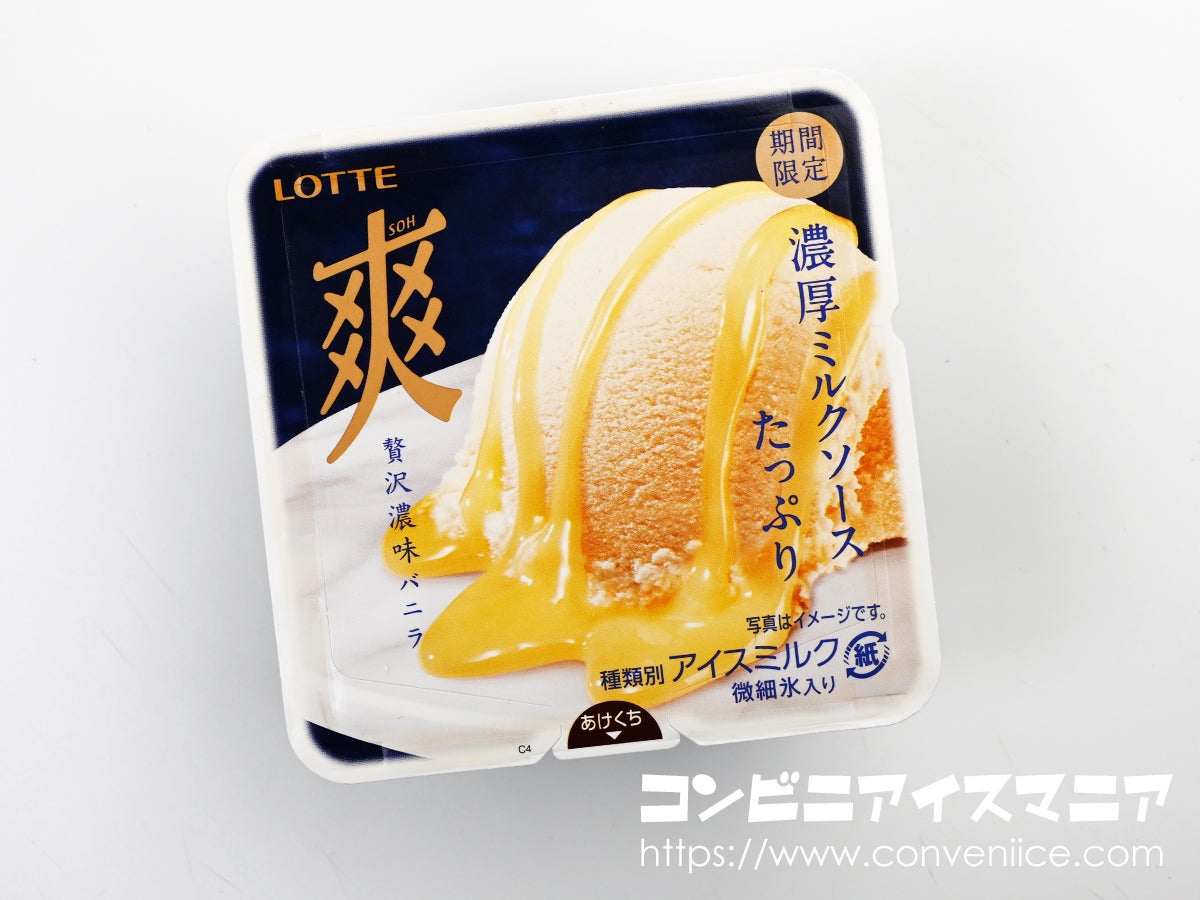商品イメージ写真がまた秀逸。バニラアイスにとろりと濃厚なミルクソースがかかったシズル感あふれるビジュアルが食欲を刺激してきます。紺地に金色という配色が、通常の爽とは一線を画す高級感を醸し出している。これぞプレミアムラインの風格です。