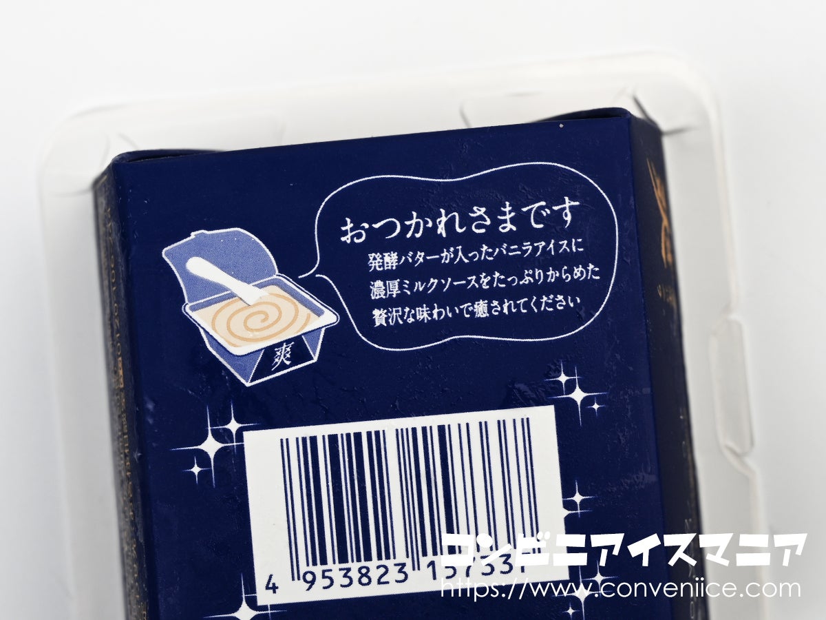 底面のイラストも大きくリニューアル。「おつかれさまです」のメッセージとともに、「発酵バターが入ったバニラアイスに濃厚ミルクソースをたっぷりからめた贅沢な味わいで癒されてください」という商品説明も。多くの人が見ないであろう底面にも、こうしてイラストやメッセージを仕込んでくるロッテの遊び心…たまりません。