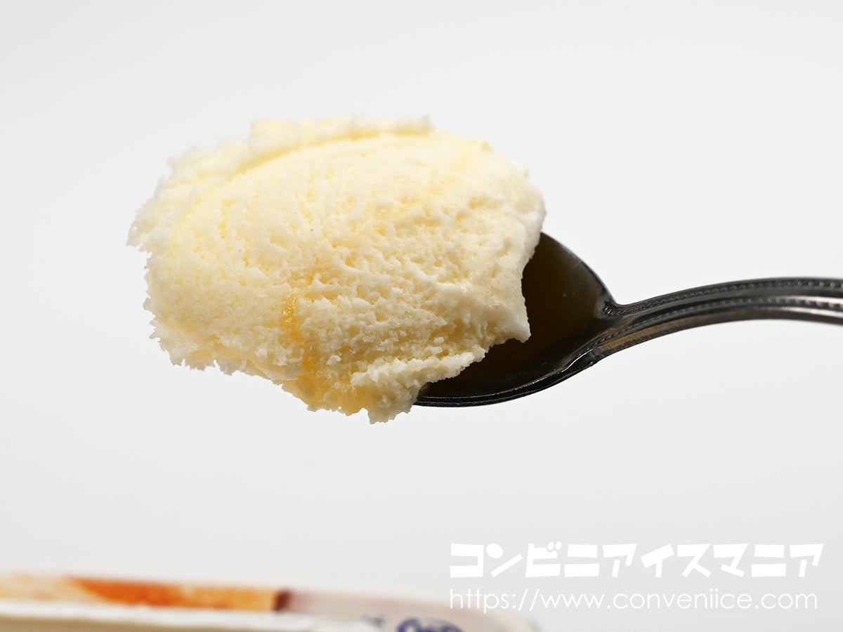 表面を見ただけで、ソースがアイス全体に層状に練り込まれていることがわかります。スプーンを入れると、微細氷特有のシャリッとした抵抗感とともにソースの層が幾重にも姿を現します。アイスをすくい上げると、バニラアイスと黄金色のソースが織りなすマーブル模様が。食べる前から商品の本気度が伝わってきます。