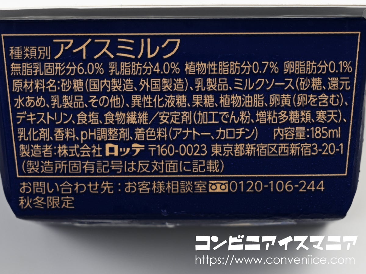 蓋を開けると、クリーム色のバニラアイスの表面に黄金色の濃厚ミルクソースが美しい渦巻き模様を描いています。まるでラテアートのような芸術的なビジュアル。これがロッテ独自の「ミルフィーユ状充填技術」の成せる業。