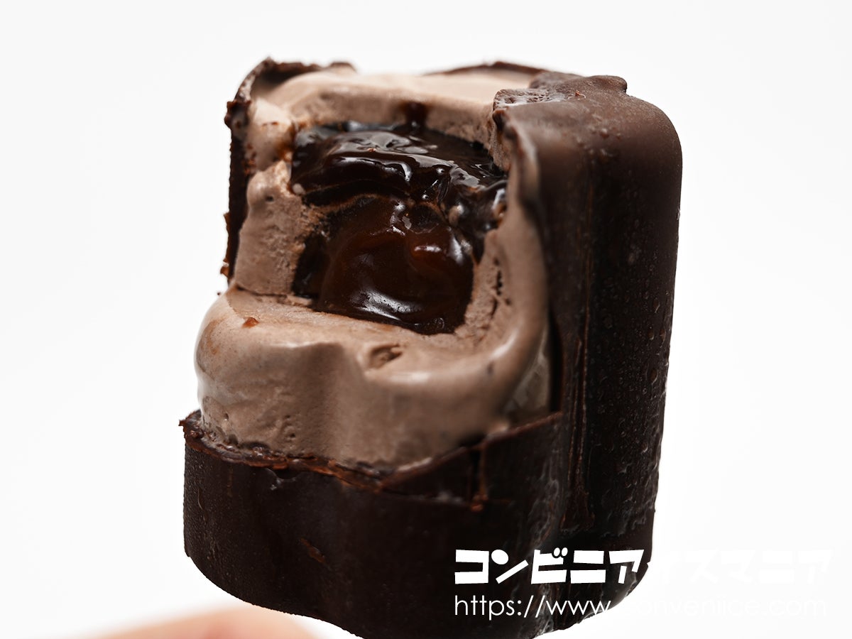 断面を見ると、外側のチョココーティングの内側にはミルクブラウン色のチョコレートアイス。その中心部には、さらに濃い色味のチョコあんが円状に配置され、最深部にはとろりと光沢を放つチョコソースが。