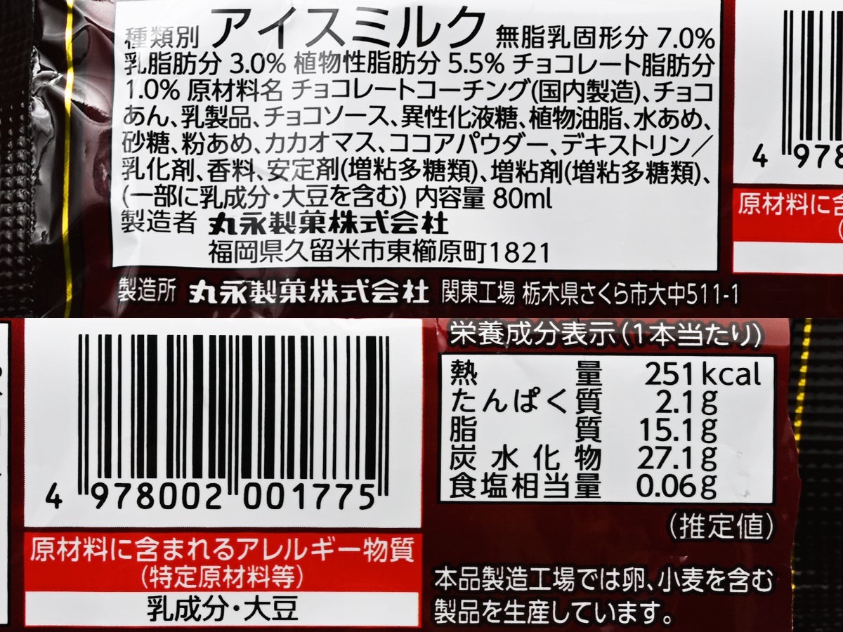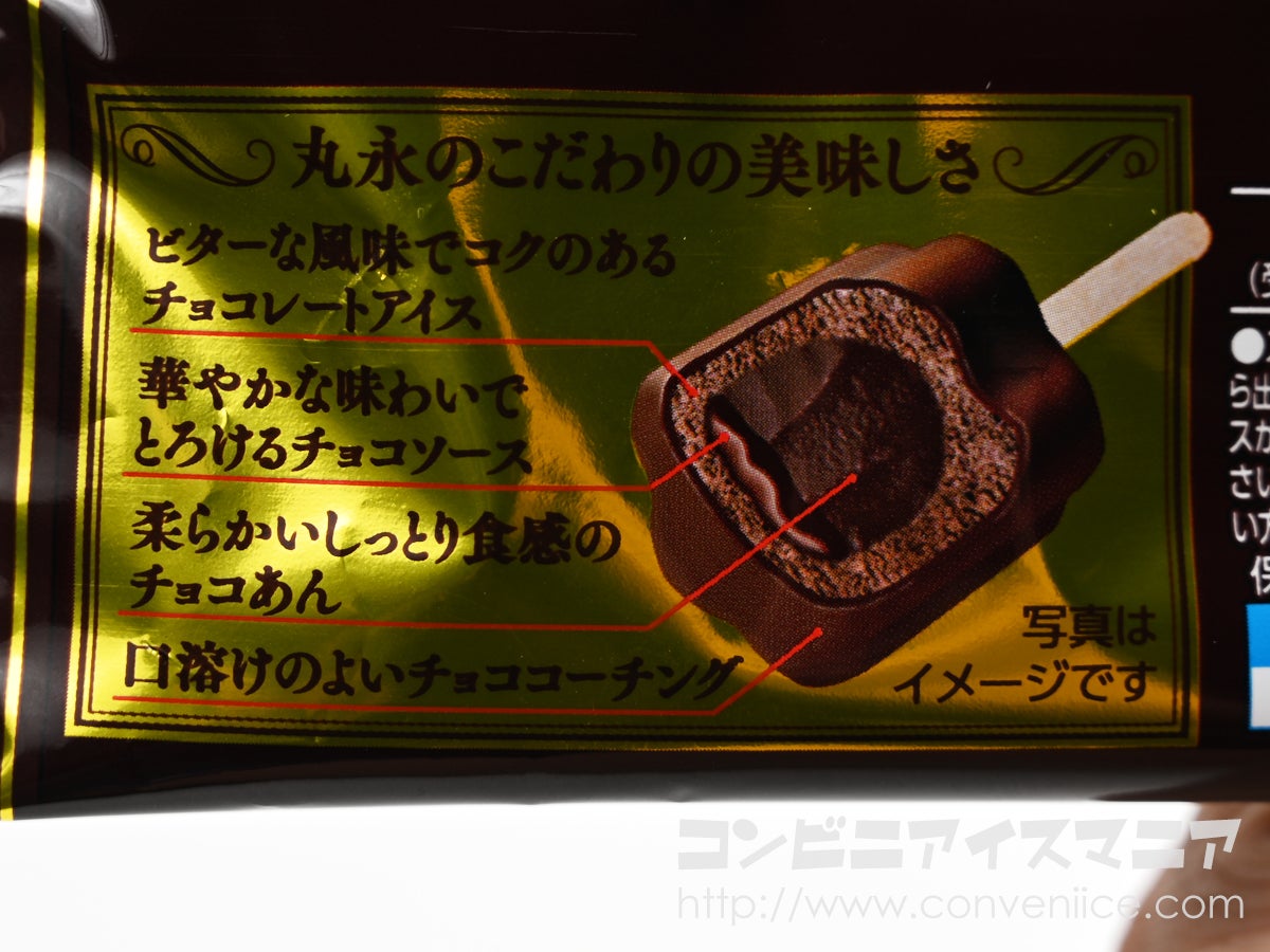裏面には「丸永のこだわりの美味しさ」として、商品構造が丁寧に図解されています。「ビターな風味でコクのあるチョコレートアイス」「華やかな味わいでとろけるチョコソース」「柔らかいしっとり食感のチョコあん」「口溶けのよいチョココーチング」——4層それぞれの役割が明記されており、メーカーのこだわりがしっかりと伝わってきます。