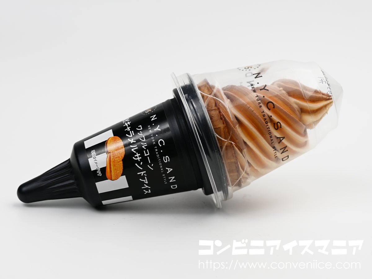 今回ご紹介するのは、セブン-イレブン限定で発売された「ワッフルコーン N.Y.キャラメルサンドアイス」。東京土産の大定番「N.Y.C.SAND」とのコラボアイス。今回はシリーズ初のワッフルコーン形態での登場となります。